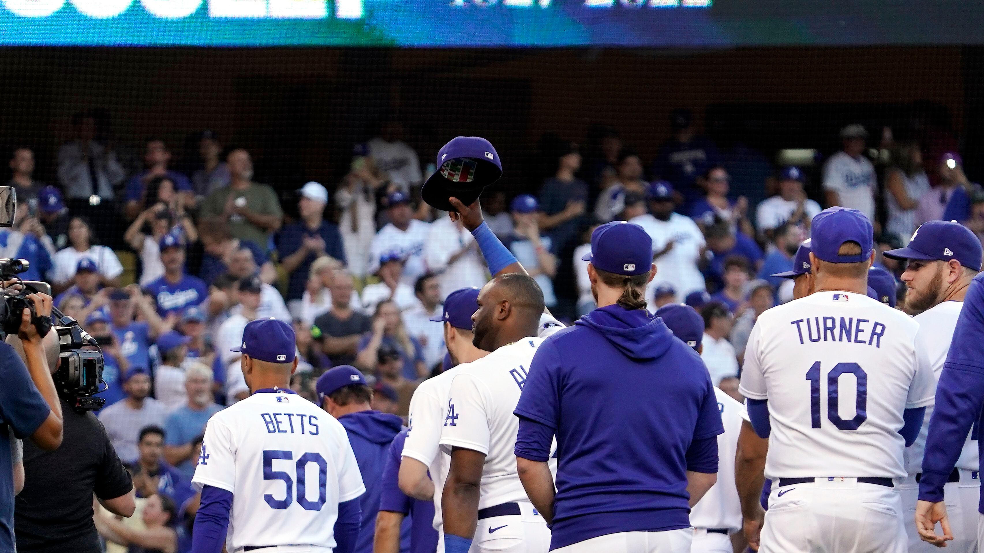 Más tarde, durante la ceremonia, los Dodgers se reunieron en el montículo para tomarse una foto con el palco de transmisiones al fondo. Se colocó una nueva pancarta, desplegada por el cronista Joe Davis y el comentarista y exlanzador Orel Hershiser, con un mensaje que decía: “Vin, te echaremos de menos”.