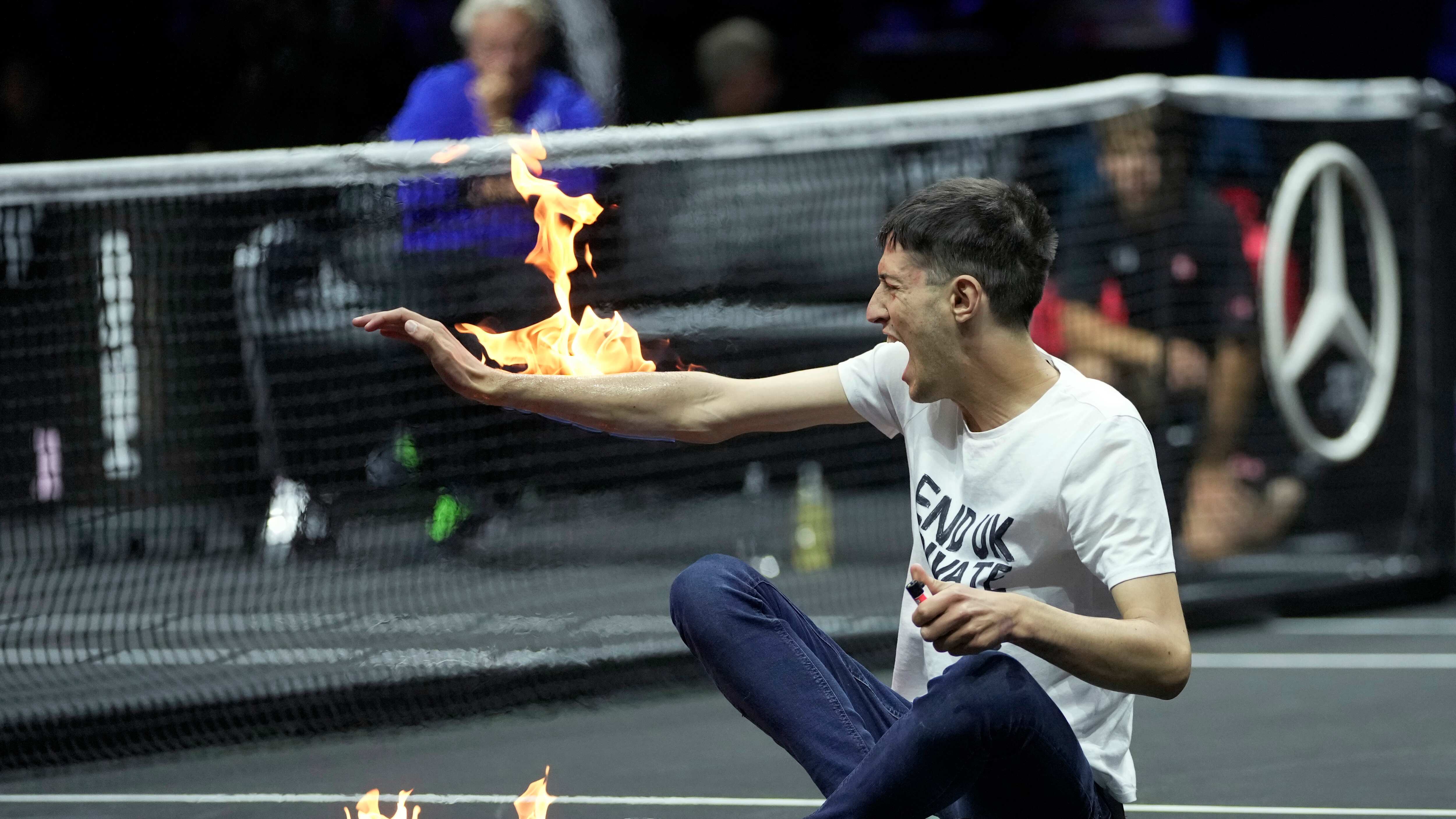 LONDRES (AP) — Un manifestante prendió fuego a una parte de la cancha y en un brazo durante un partido en el evento de tenis Copa Laver el viernes, horas antes de que Roger Federer jugara por última vez antes de retirarse.