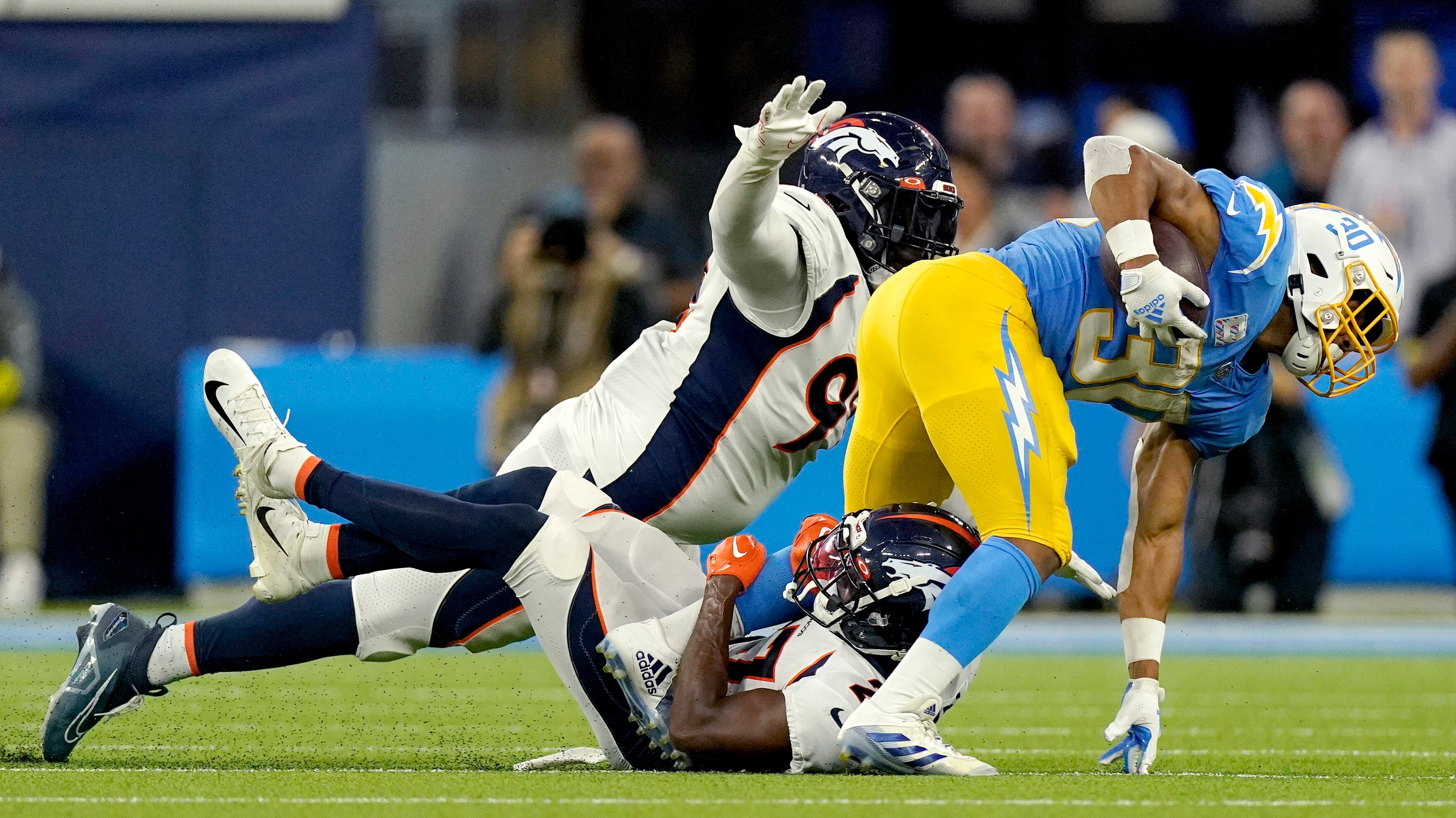 Los Chargers capturaron cuatro veces a Russell Wilson, pero permitieron tres jugadas de 30 yardas o más en la primera mitad. Entre éstas figuró un touchdown de 39 yardas después de que Wilson le lanzó al tight end Greg Dulcich.