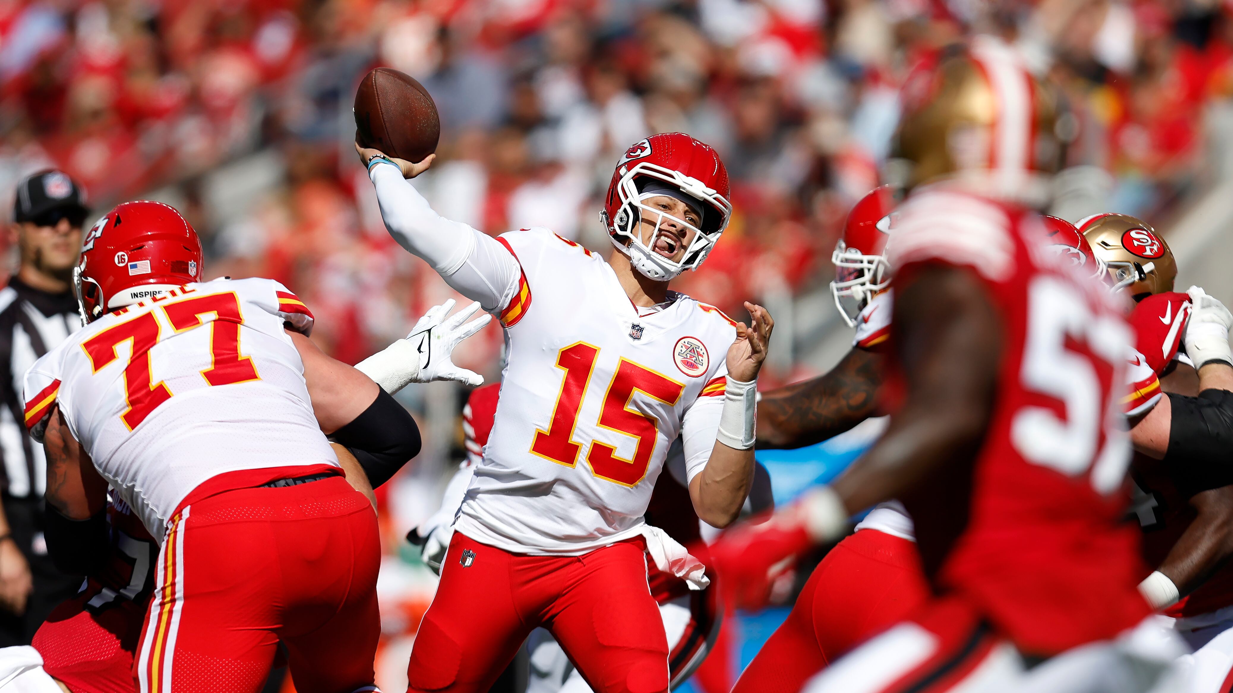 Mahomes tuvo un inicio complicado en un duelo de “revancha” de Super Bowl, con una intercepción tempranera, que puso en problemas a Kansas City (5-2) al irse abajo 10-0, pero una vez más demostró que no es problema al liderar a los Chiefs a anotar en seis de las siguientes siete series ofensivas.