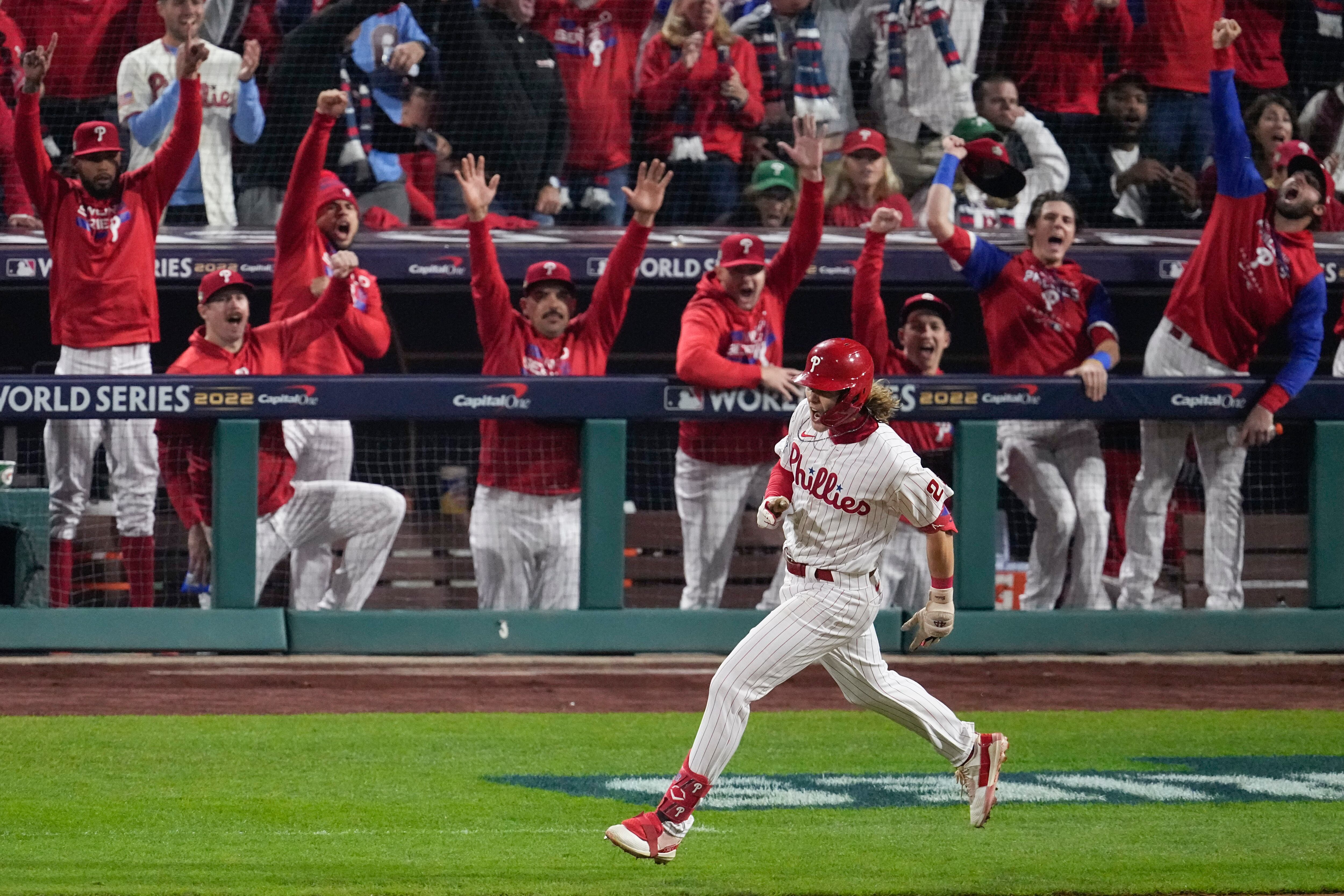 Alec Bohm, de los Filis de Filadelfia, celebra su jonrón en el tercer juego de la Serie Mundial ante los Astros de Houston, el martes 1 de noviembre de 2022 (AP Foto/Matt Rourke) AP (Matt Rourke/AP)