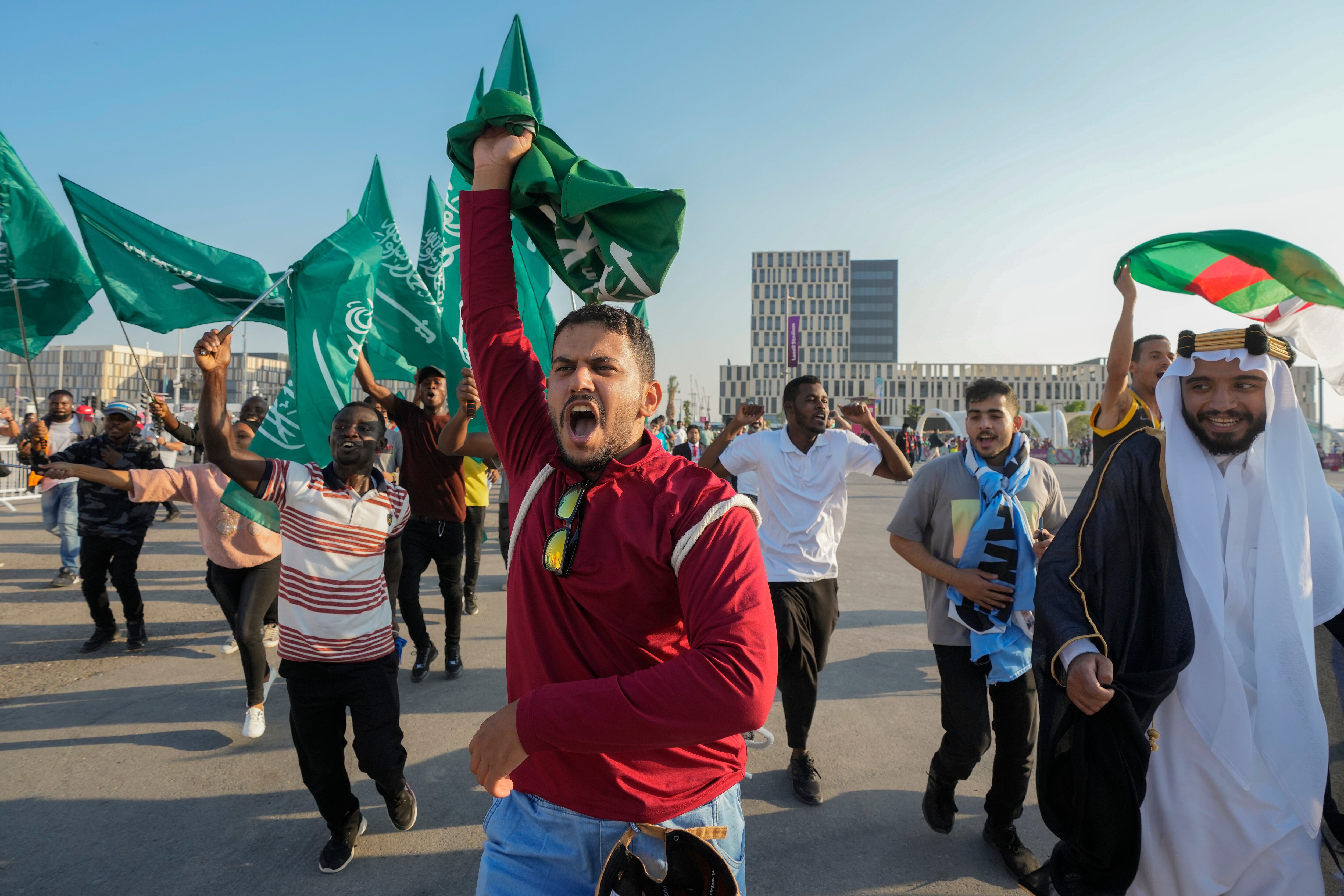Tras una de las mayores sorpresas en la historia del torneo, los hinchas inundaron las calles próximas al estadio Lusail ondeando banderas saudíes verdes y blancas. Luego entraron a una estación de metro cercana cantando e incluso abrazando a los seguidores argentinos.