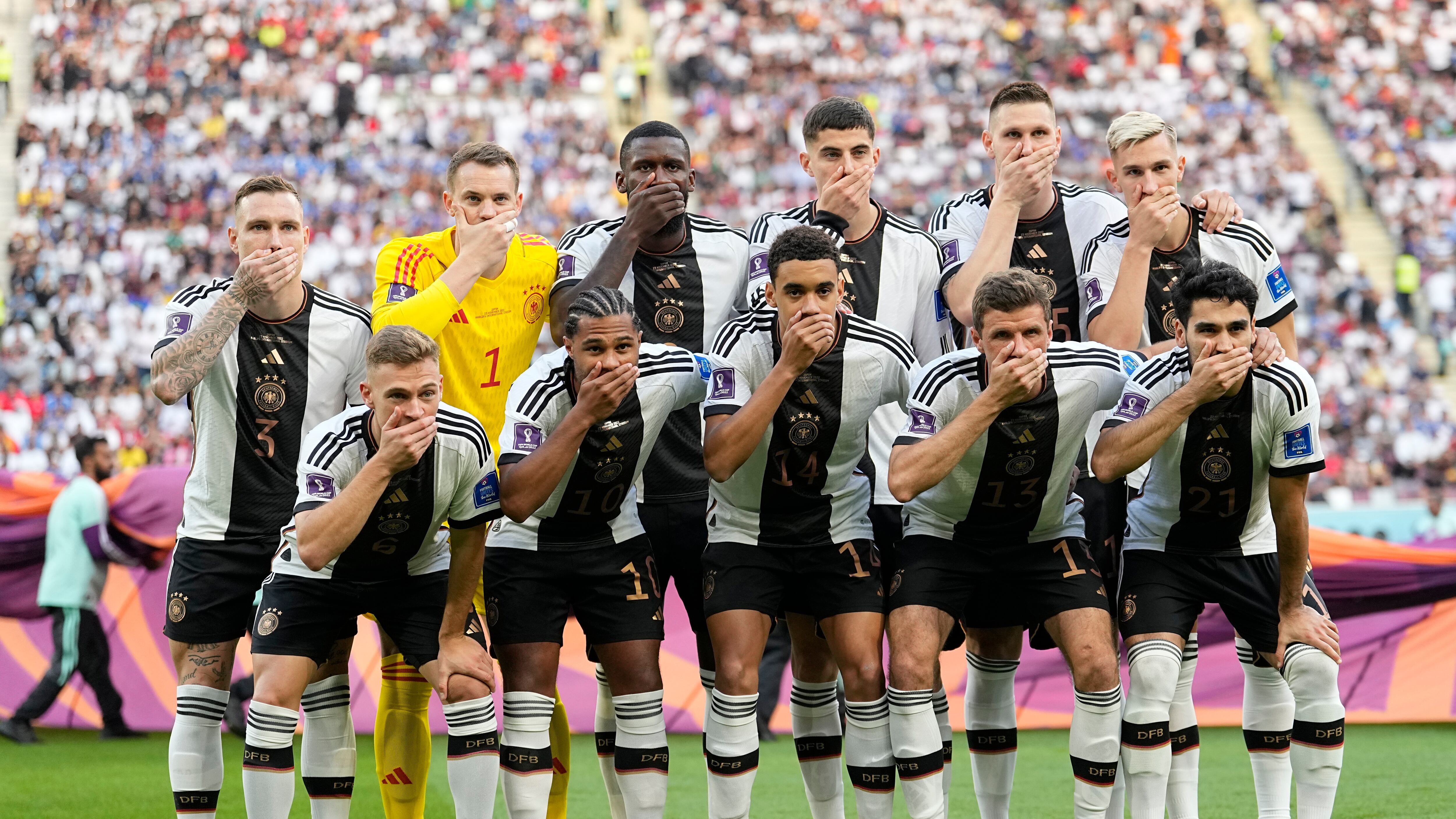 Los jugadores de Alemania se cubrieron la boca para la foto del equipo antes de su primer partido en señal de protesta contra la FIFA luego de la represión del organismo rector contra el brazalete de la campaña antidiscriminación “One Love”. Lucir los colores del arco iris, un símbolo de los derechos LGBTQ, ha sido un tema polémico clave. Algunas autoridades europeas han llevado esos colores a las gradas.