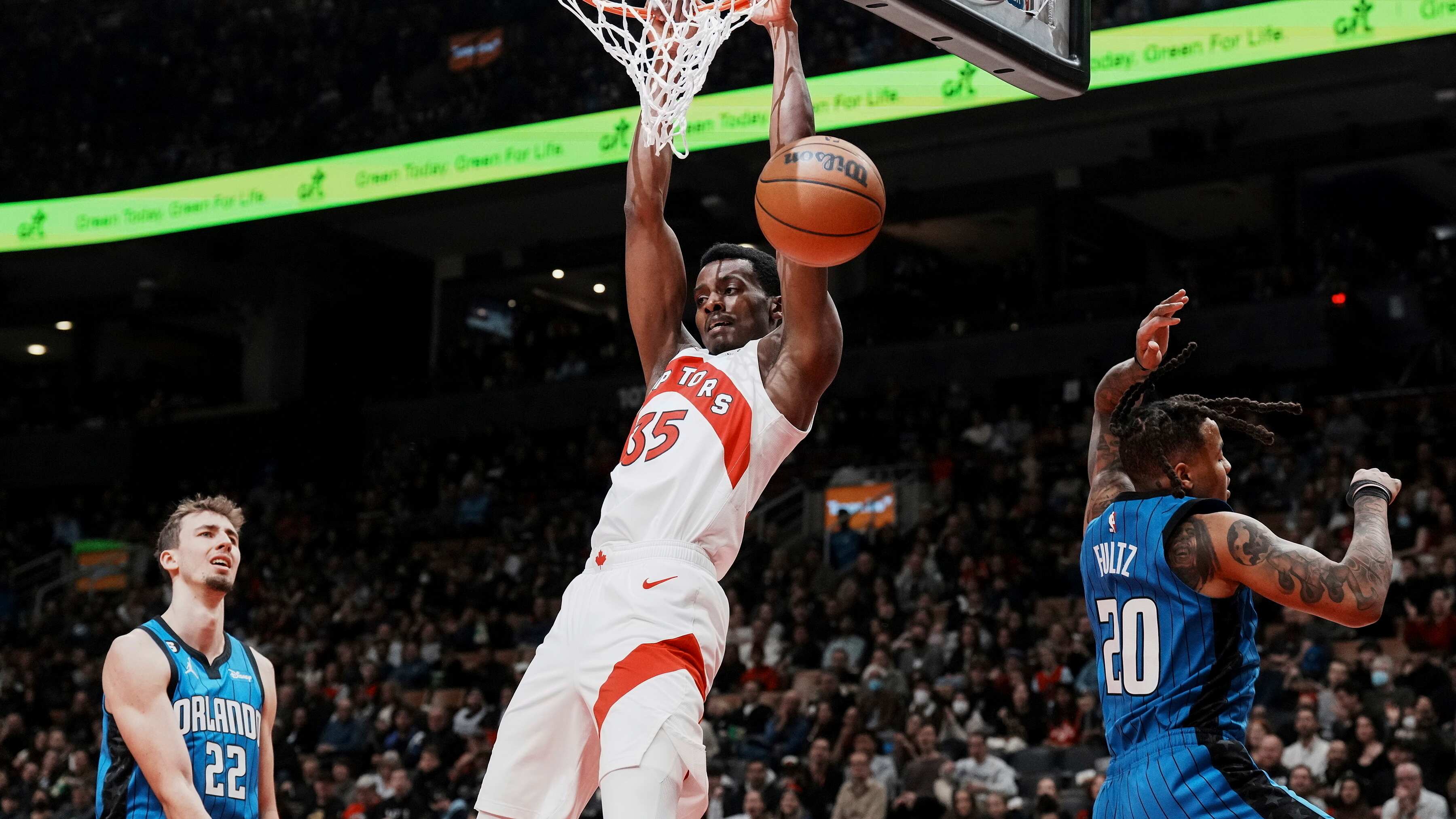 Toronto clavó el balón cinco veces en el primer periodo y 26 puntos en la pintura para irse arriba 36-22.