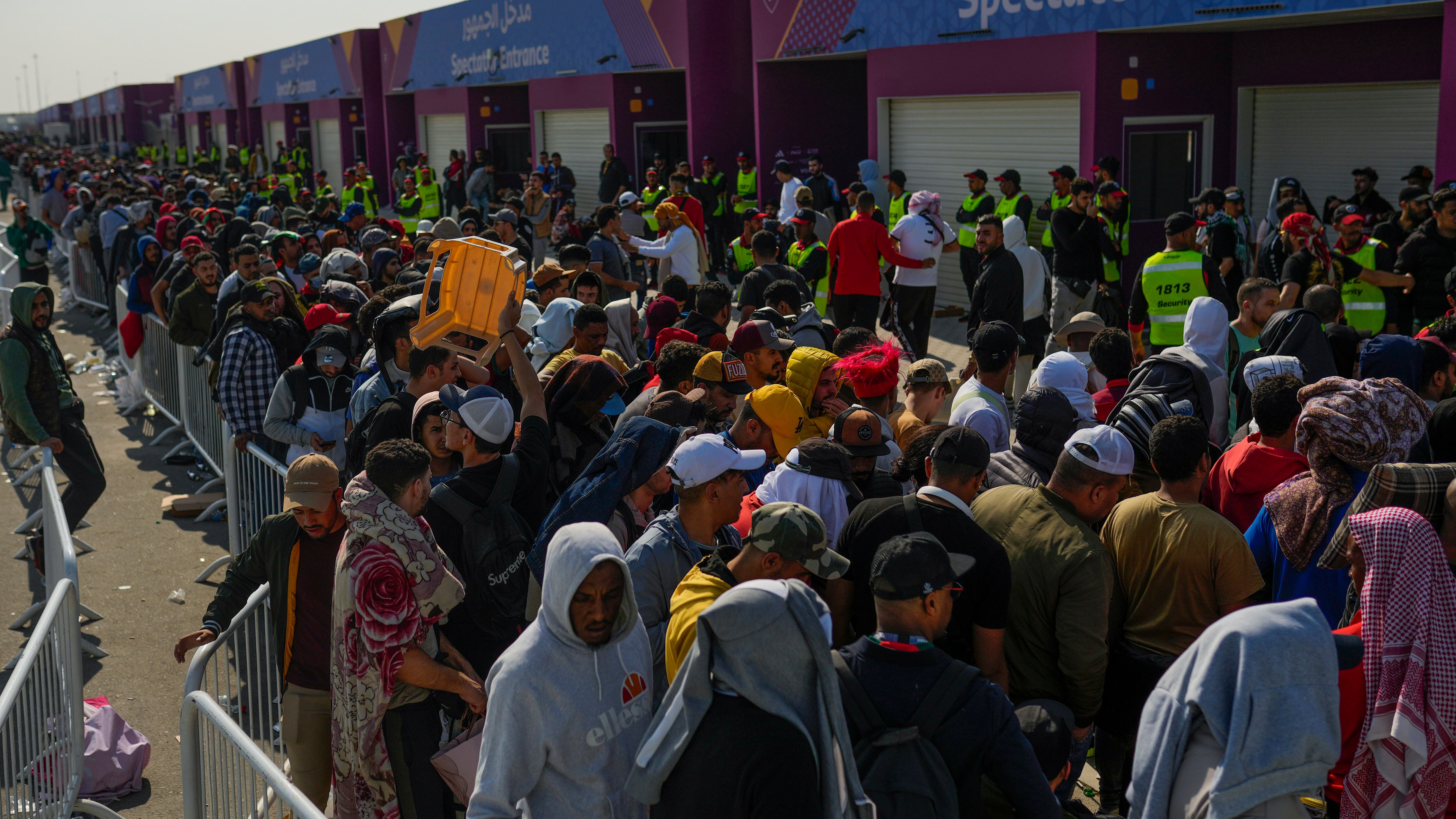 AL WAKRAH, Qatar (AP) — Cientos de hinchas de Marruecos hicieron cola el martes afuera del estadio Al Janoub con la esperanza de obtener una entrada gratis para la semifinal que su selección disputará el miércoles contra Francia en la Copa Mundial.
