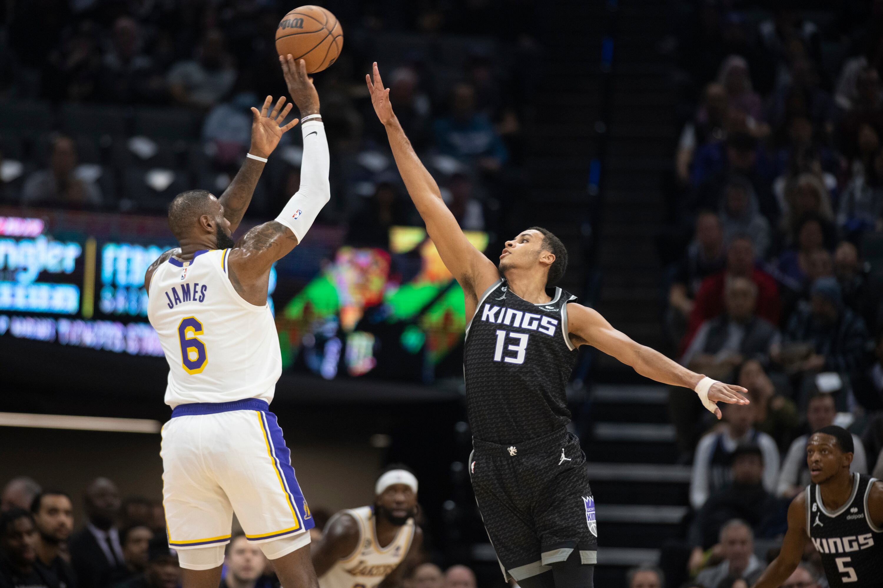 James también finalizó con ocho rebotes y siete asistencias. Provocó la sexta falta de Domantas Sabonis con 48,1 segundos por jugar y concretó una jugada de tres puntos para poner a los Lakers arriba por un tanto.