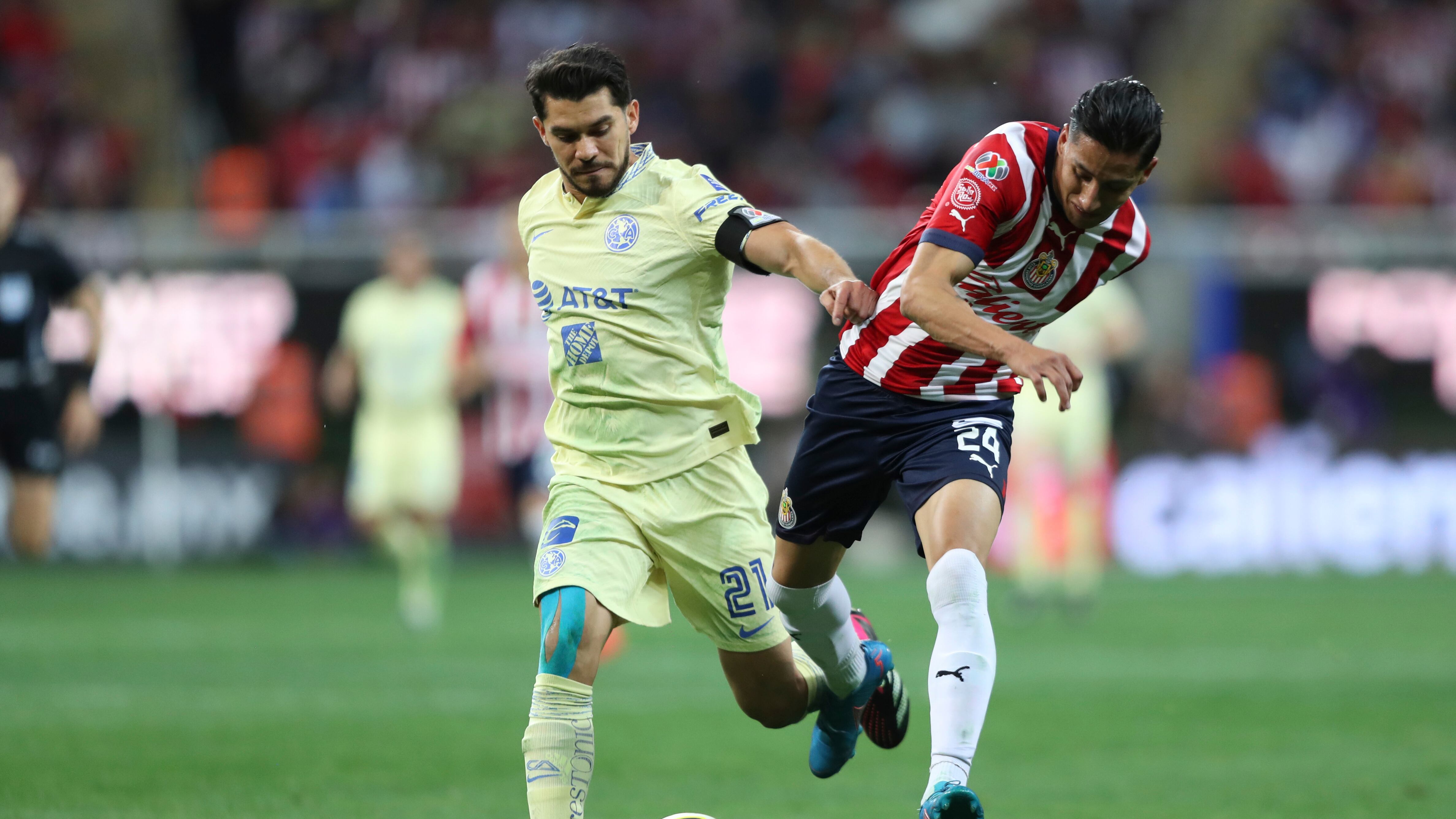 El jugador del América Henry Martín, a la izquierda, y el jugador del Chivas Carlos Cisneros luchan por el balón en el partido por el torneo Clausura mexicano en el estadio Akron de Guadalajara, México, el sábado 18 de marzo de 2023. (AP Foto) (AP)