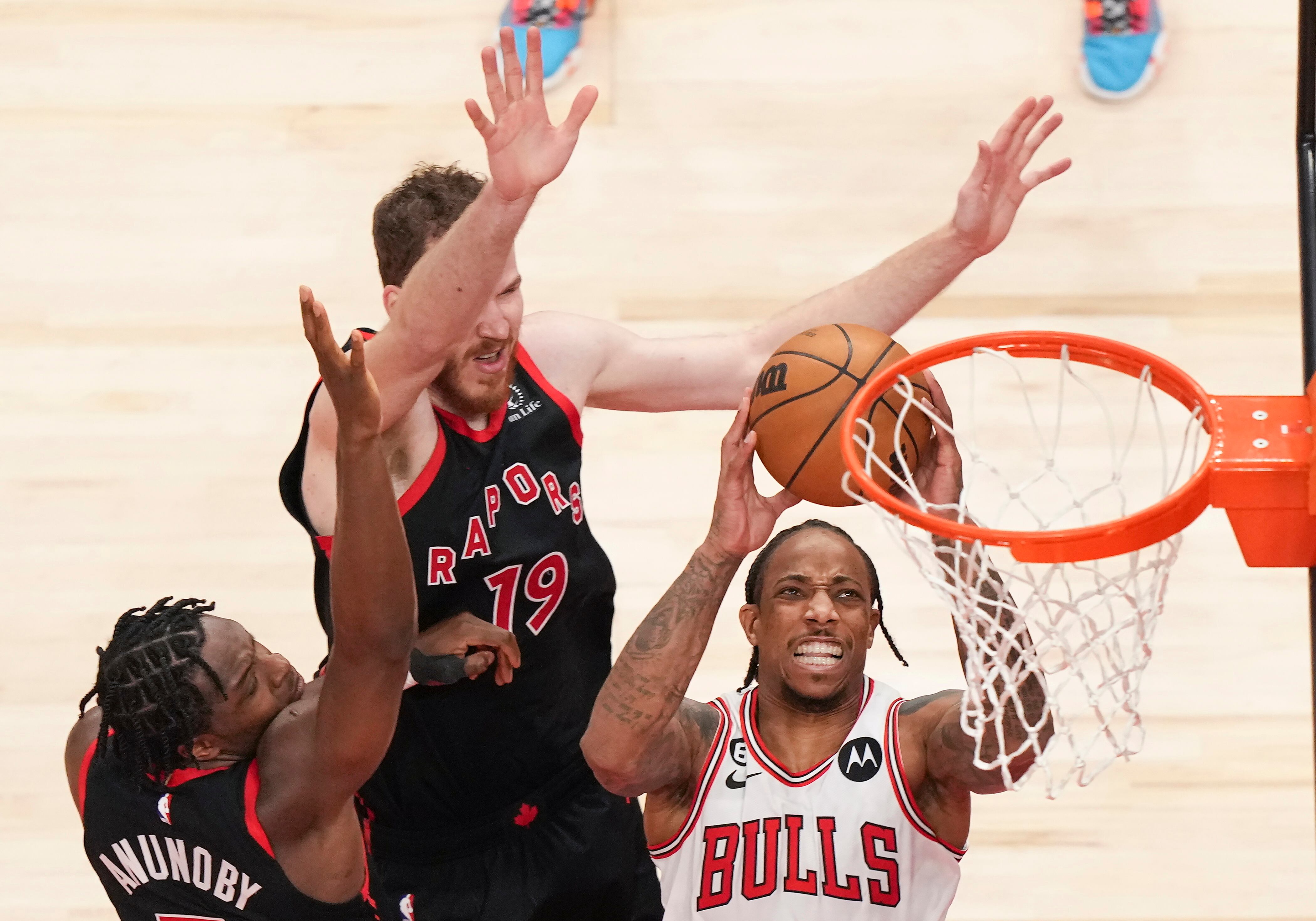 Zach LaVine anotó 39 puntos, DeMar DeRozan añadió 23 ante su equipo anterior y los Bulls de Chicago se sobrepusieron a un déficit de 19 unidades para vencer el miércoles 109-105 a los Raptors de Toronto en un partido del minitorneo de repechaje.