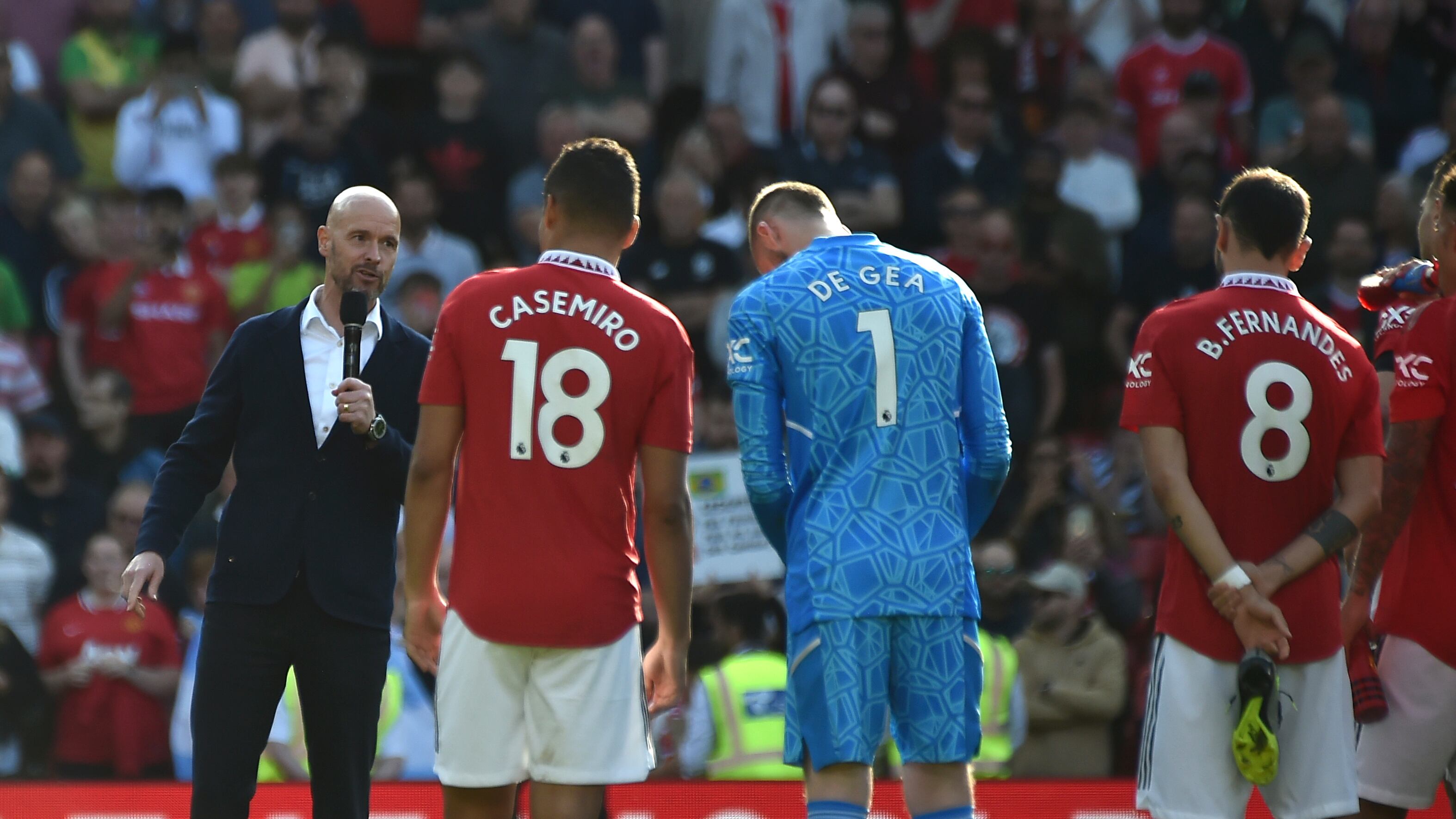 El rugido se hizo ensordecer dentro de Old Trafford cuando Erik ten Hag se dirigió a la afición del Manchester United desde el círculo central, recordándoles el papel que tienen al tratar de preservar el mayor logro en la historia del club.