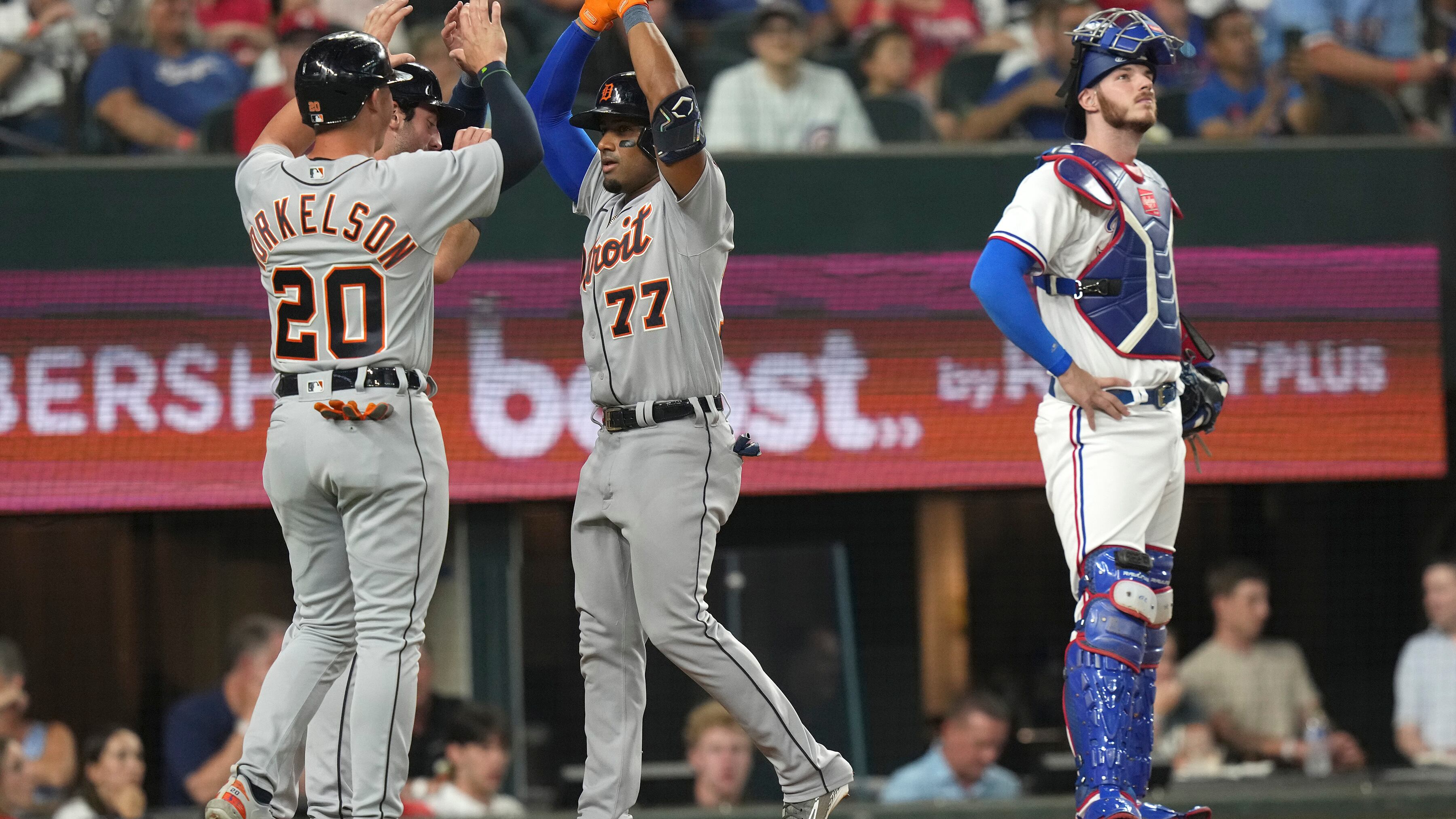 El novato Mason Englert (3-2), el tercero de seis lanzadores de Detroit que se combinaron para otorgar 16 ponches, concedió una carrera en dos innings y un tercio. El derecho originario de Forney, Texas, a unos 65 kilómetros (40 millas) del Globe Life Field, fue seleccionado por los Rangers en la cuarta ronda del draft de 2018 y llegó a los Tigres antes de esta campaña.