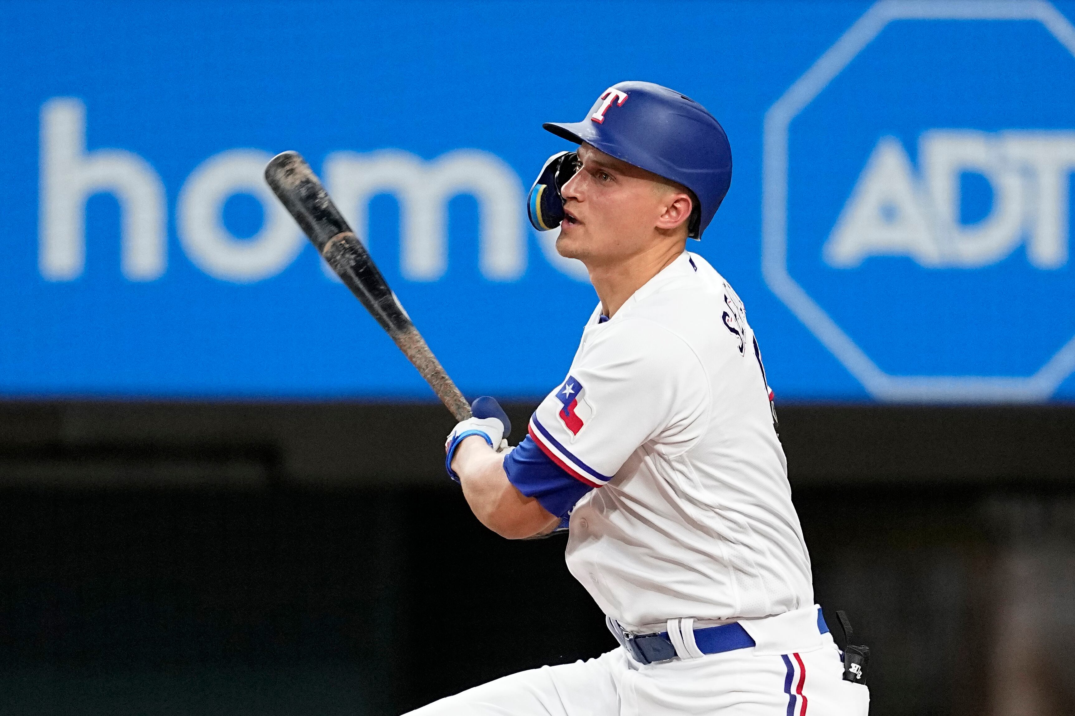 Cory Seager, de los Rangers de Texas, sigue el movimiento después de batear un sencillo productor de una carrera en la segunda entrada del juego de béisbol en contra de los Medias Blancas de Chicago, el miércoles 2 de agosto de 2023, en Arlington, Texa AP (Tony Gutierrez/AP)
