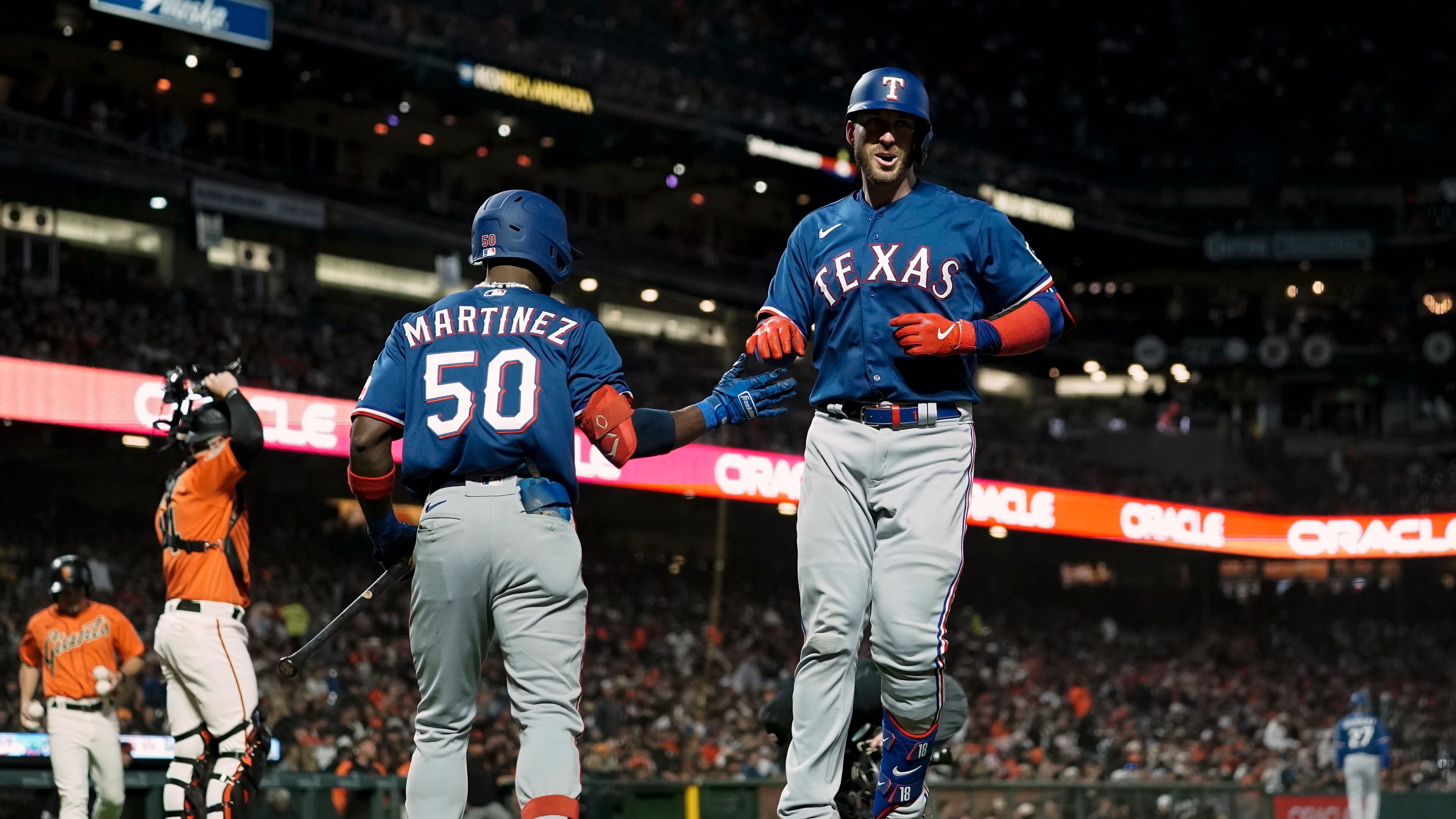 SAN FRANCISCO (AP) — Nathaniel Lowe bateó un cuadrangular con dos outs en el sexto inning para romper el empate a cero, Mitch Garver logró otro jonrón un lanzamiento después, y Bruce Bochy, manager de los Rangers de Texas, venció el viernes 2-1 a los Gigantes de San Francisco, su equipo anterior que lo recibió con amor y fanfarrias.