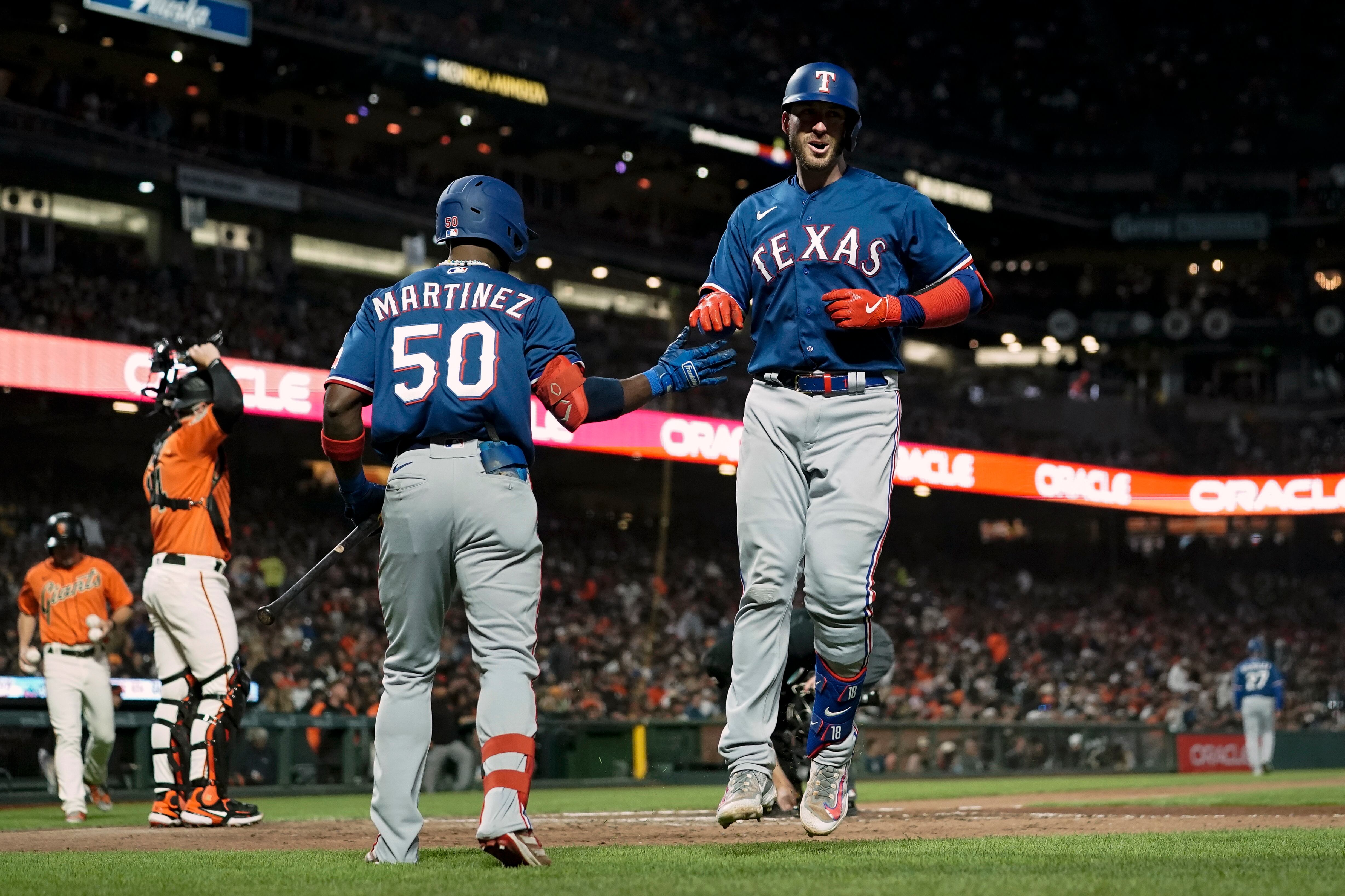 SAN FRANCISCO (AP) — Nathaniel Lowe bateó un cuadrangular con dos outs en el sexto inning para romper el empate a cero, Mitch Garver logró otro jonrón un lanzamiento después, y Bruce Bochy, manager de los Rangers de Texas, venció el viernes 2-1 a los Gigantes de San Francisco, su equipo anterior que lo recibió con amor y fanfarrias.