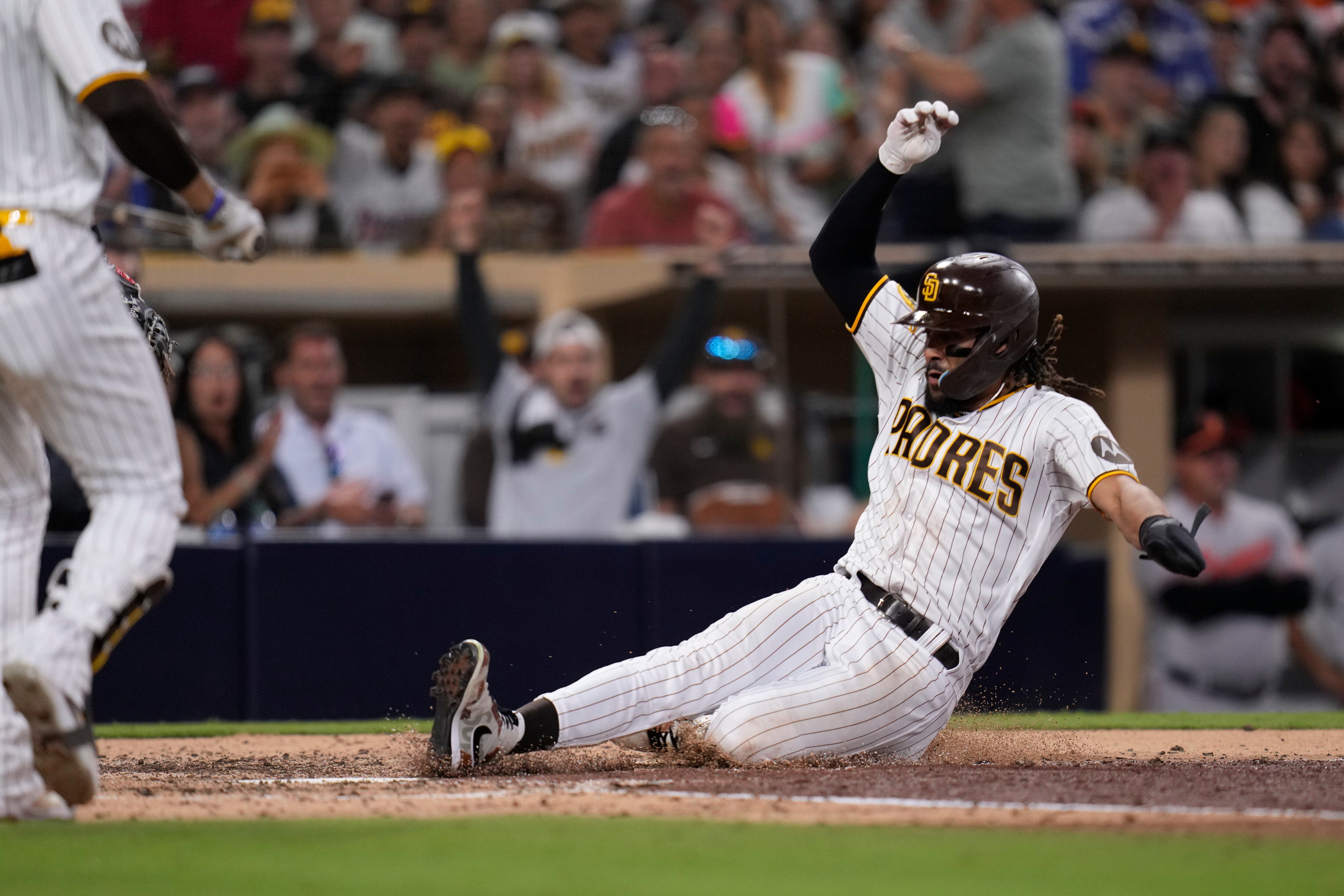 Tatis se deslizó y saltó para celebrar. Abrazó a Jake Cronenworth en el escalón más alto de la cueva y festejó con el resto de sus compañeros.