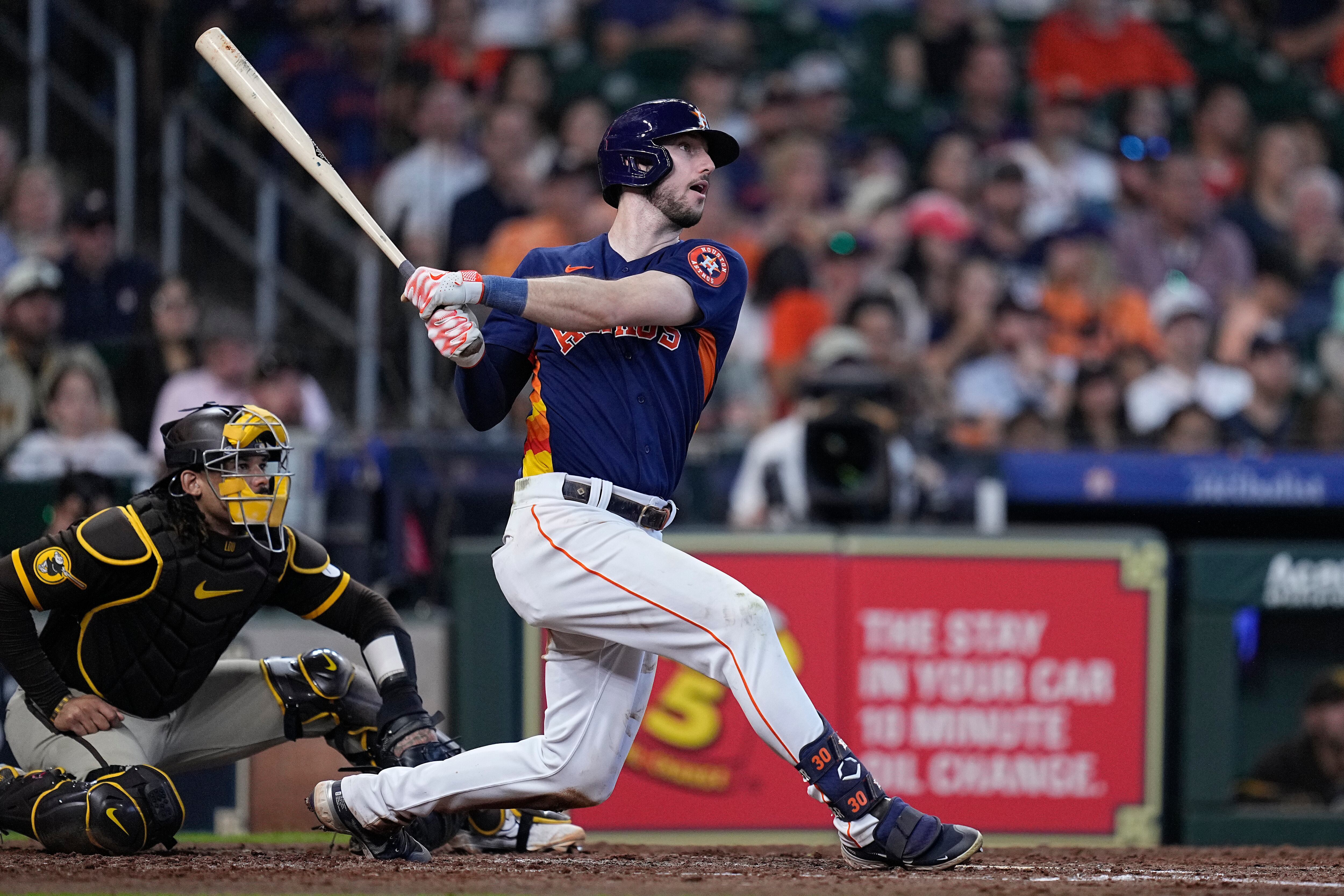 HOUSTON (AP) — Kyle Tucker conectó un par de triples dentro del racimo de ocho carreras en el sexto episodio, el venezolano José Altuve disparó un cuadrangular y remolcó tres carreras, y los líderes Astros de Houston apalearon el domingo 12-2 a los Padres de San Diego.
