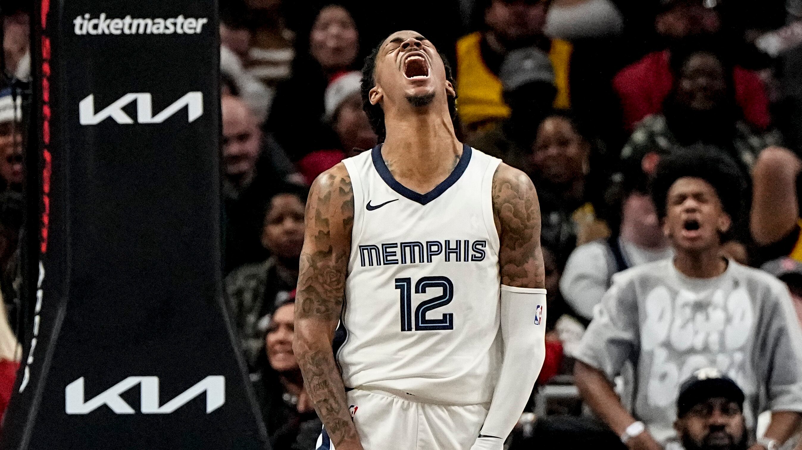 Ja Morant, de los Grizzlies de Memphis, festeja una volcada en el duelo del sábado 23 de diciembre de 2023, ante los Hawks de Atlanta (AP Foto/Mike Stewart) AP (Mike Stewart/AP)