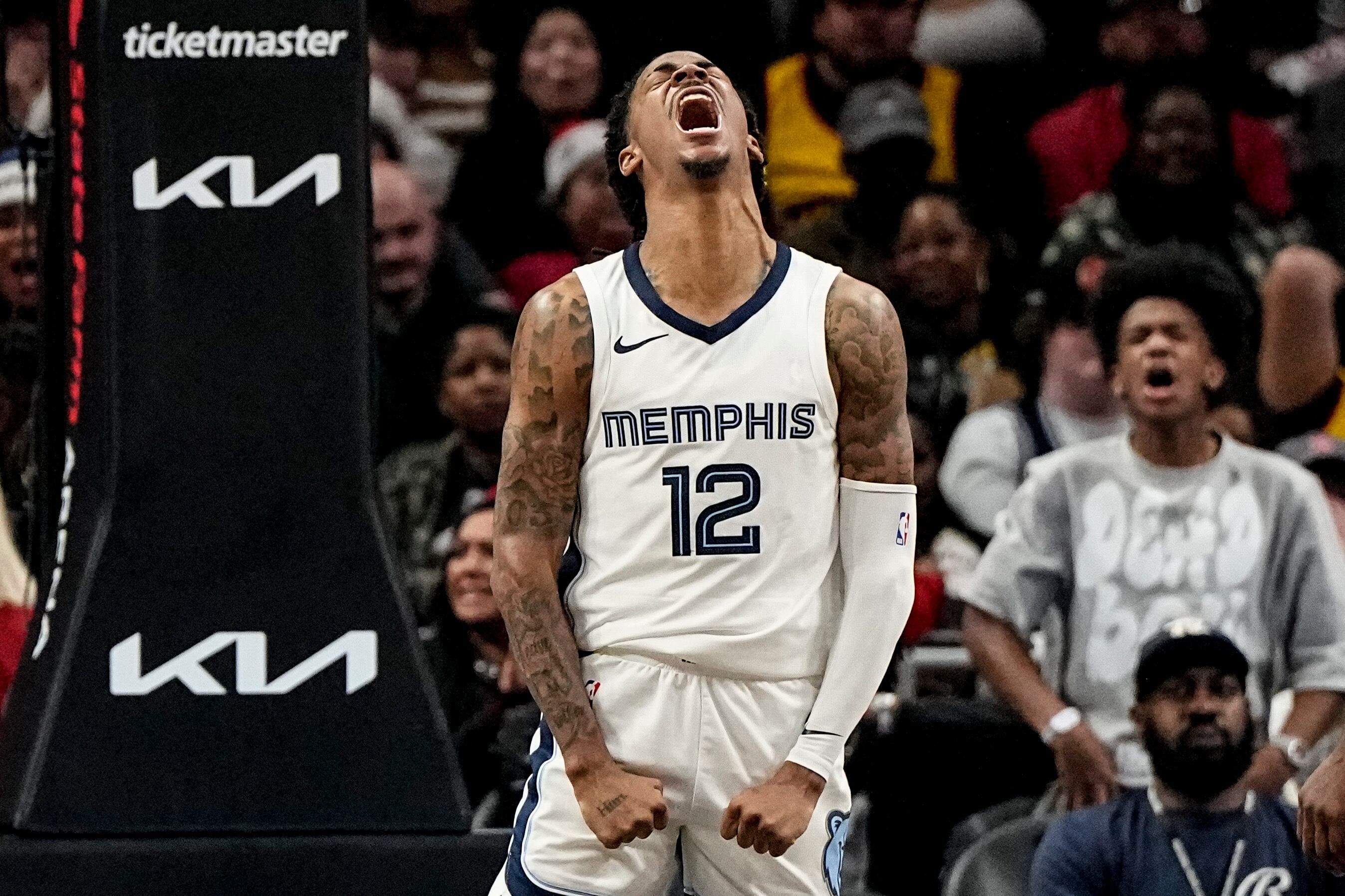 Ja Morant, de los Grizzlies de Memphis, festeja una volcada en el duelo del sábado 23 de diciembre de 2023, ante los Hawks de Atlanta (AP Foto/Mike Stewart) AP (Mike Stewart/AP)