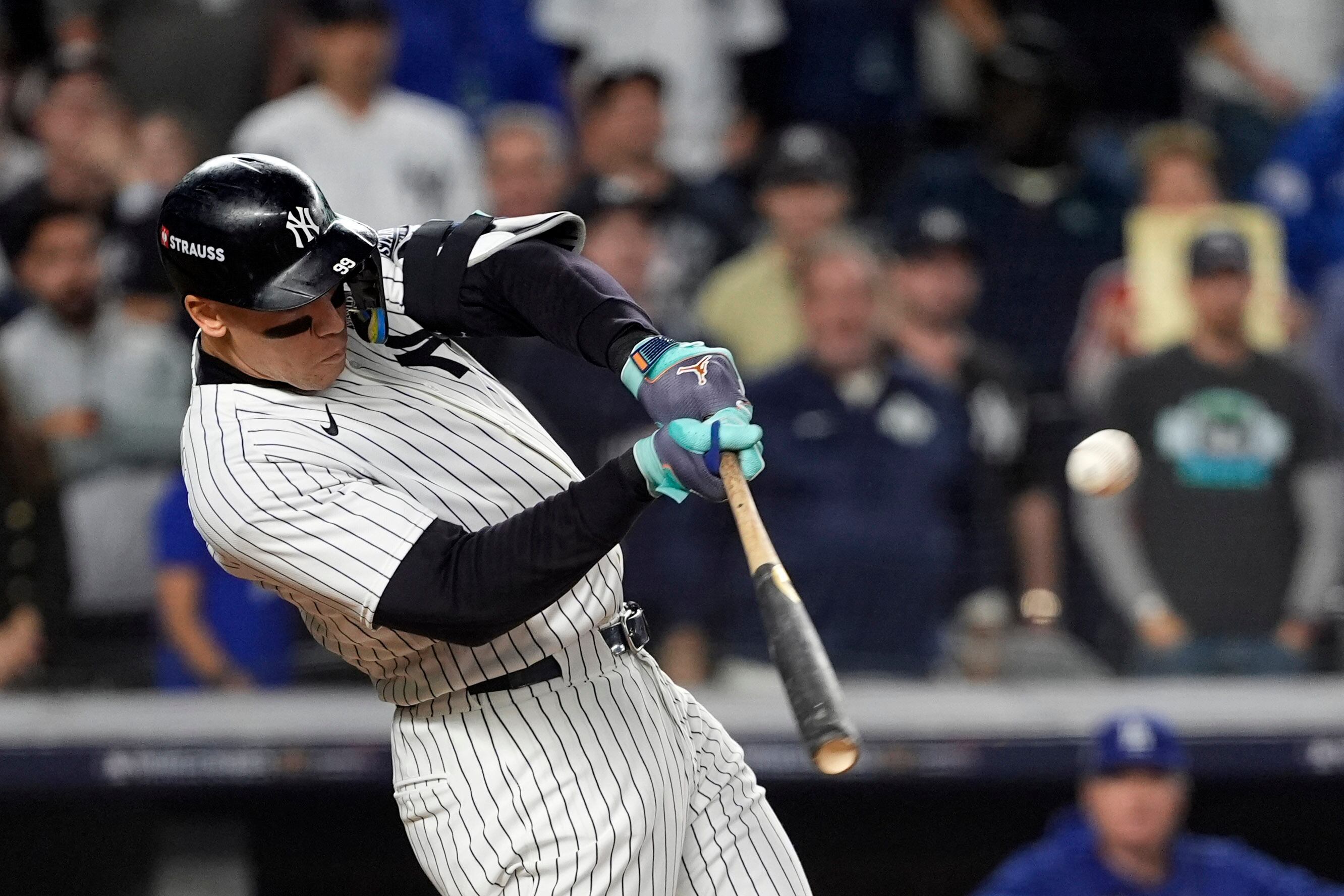 El toletero estelar salió de una mala racha de postemporada con su primer jonrón de dos carreras en la serie el miércoles por la noche, poniendo a los Yankees de Nueva York adelante contra los Dodgers de Los Ángeles en la primera entrada,
