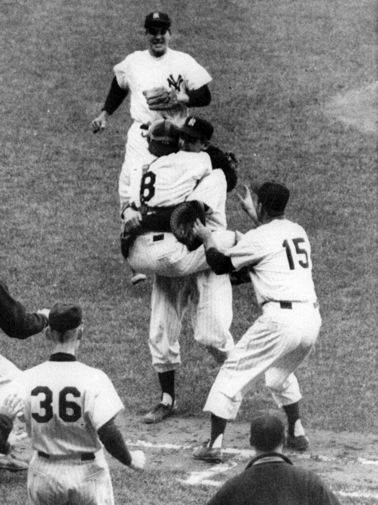 Don Larsen pitched the only perfect game in World Series history in the fifth game of 1956 in the Bronx. Yogi Berra jumped into his arms after the final out, and the Yankees went on to win Game 7 behind Johnny Kucks' three-hit shutout in what turned out to be the last game of the World Series at the legendary Ebbets Field stadium.