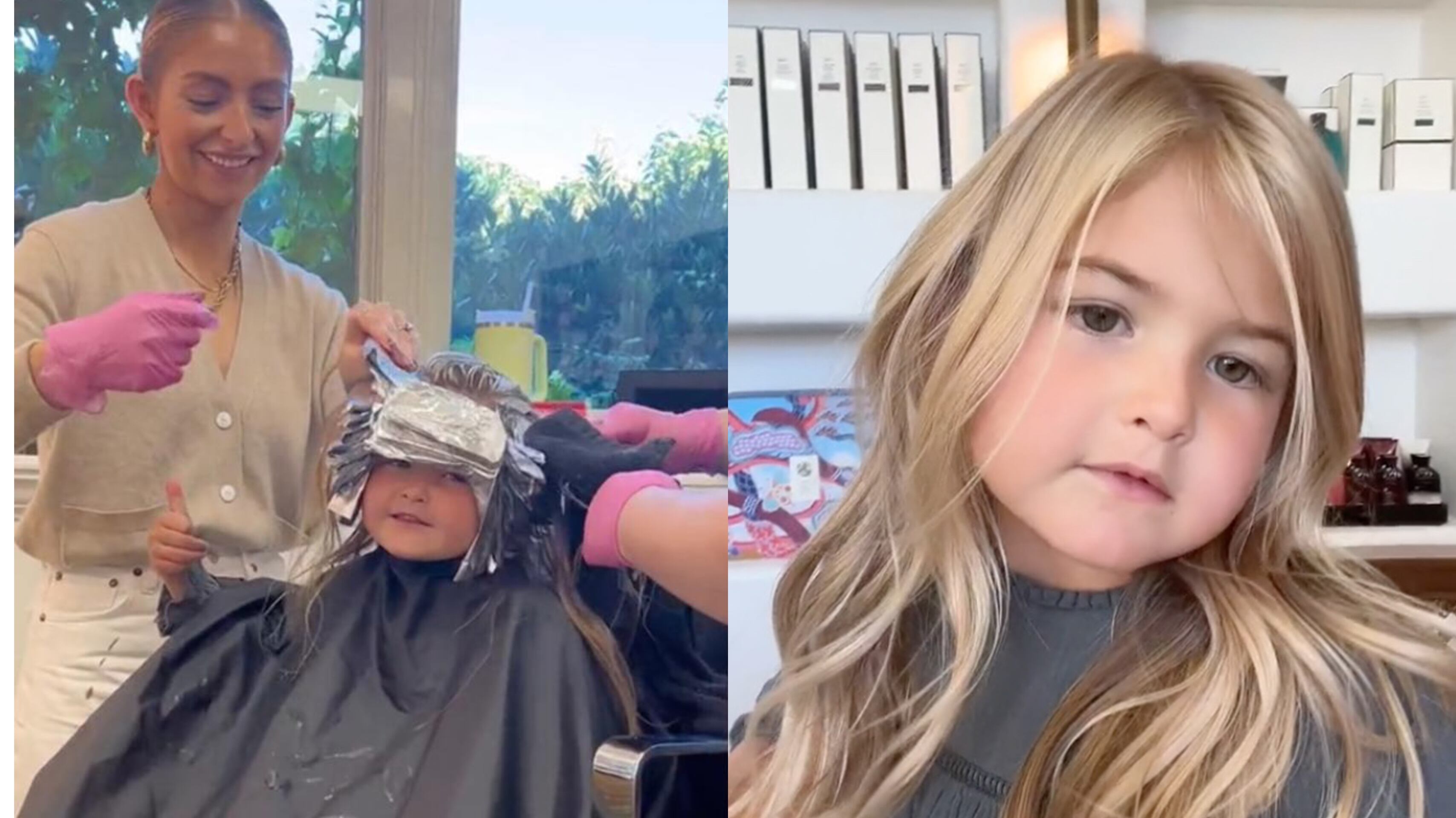 En un clip adorable, Maude le da a su madre un pulgar hacia arriba mientras dos peluqueros colocan láminas en su cabecita para que coincida con la de su madre.