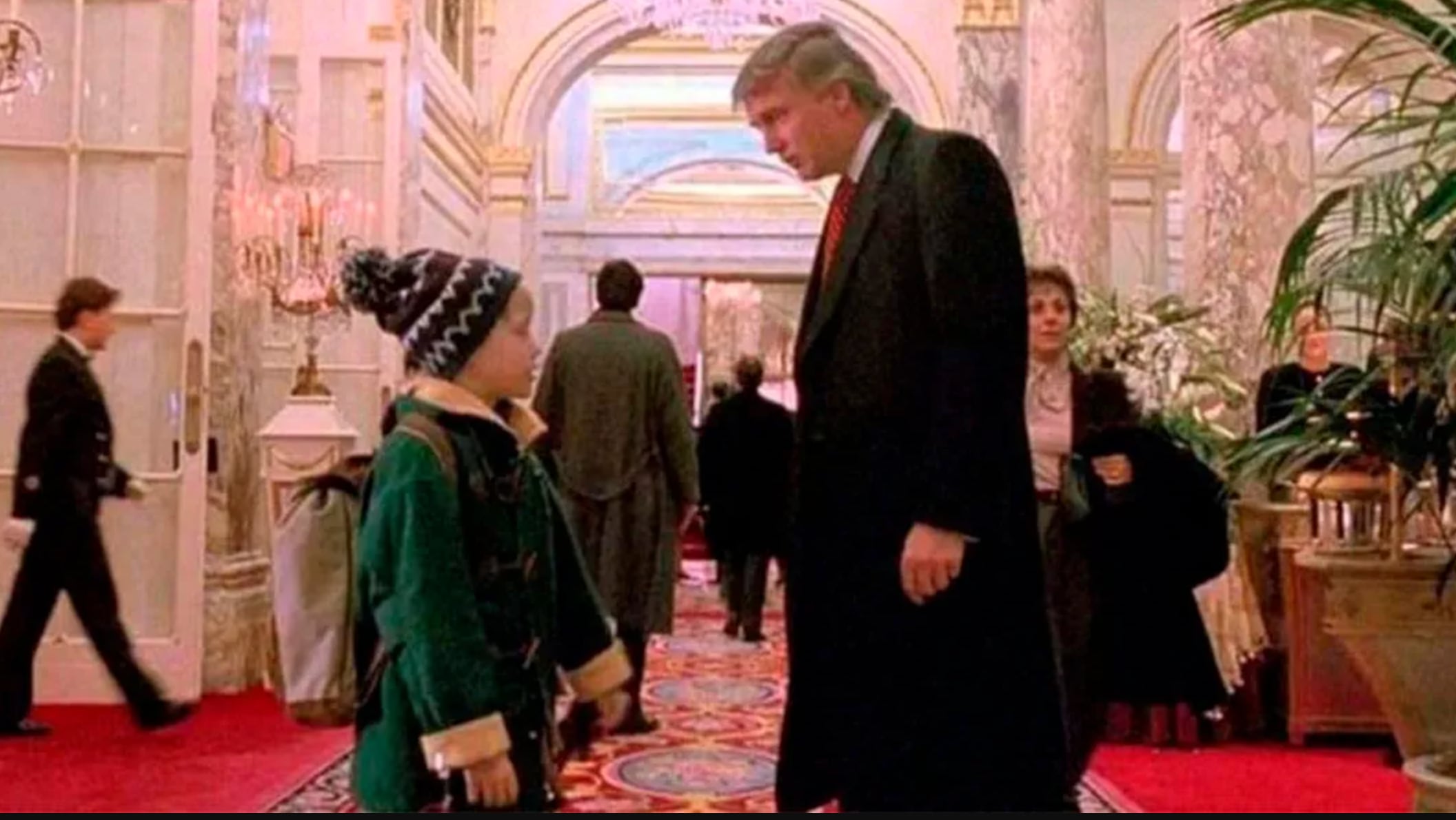 En la escena, Kevin McCallister, interpretado por Macaulay Culkin, entra al lujoso hotel y se acerca al mostrador de recepción, donde Trump se encuentra. En un gesto cómico, Kevin le pregunta a Trump sobre la ubicación de la recepción, a lo que Trump responde con cortesía y señala la dirección correcta.