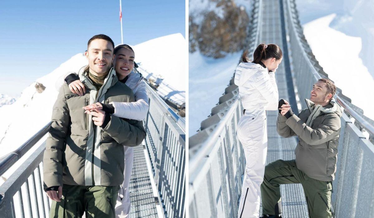 Por medio de sus cuentas de Instagram, los actores compartieron una serie de fotos de la propuesta, la cual se dio mientras estaban esquiando, en Gstaad, Suiza.