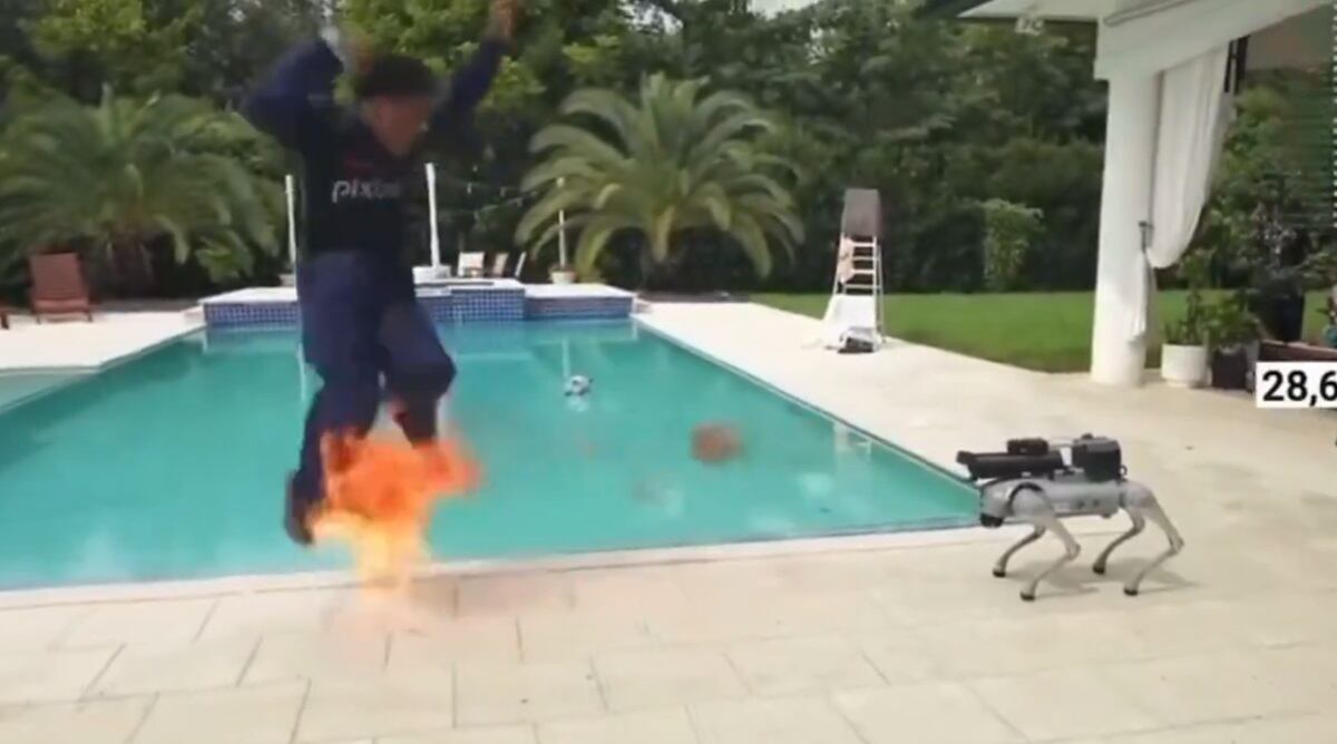 Para apagar el fuego, Speed se arrojó a una piscina cercana. El robot, aparentemente funcionando de manera autónoma, se acercó peligrosamente al borde de la piscina antes de que el equipo de producción lograra desactivarlo.