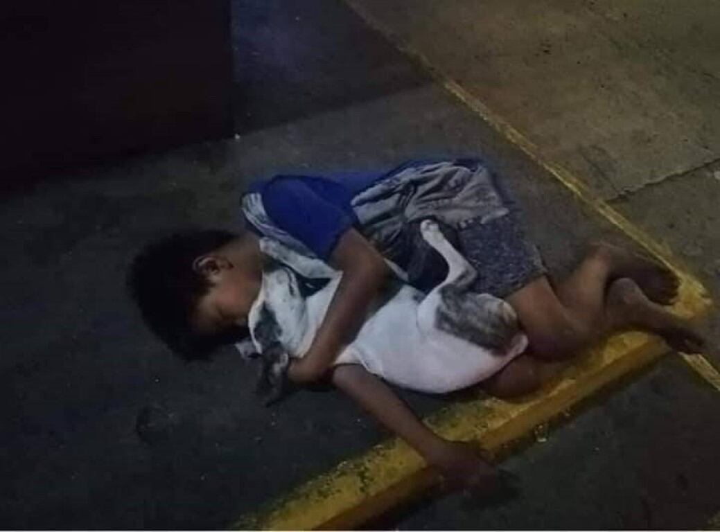 En la postal que se ha hecho viral desde hace algunos días se puede ver a un pequeño tirado en el césped, que intenta dormir, mientras abraza con fuerza a su perrito. Es una clara muestra de amor, en la que ambos seres se demuestran su gran amor, mientras producen calor para contra el fuerte frío de la noche.