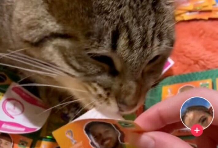 El michi atigrado sale en un clip de la usuaria de la red social @alidapazzz, quien mostró en apenas 18 segundos al felino ayudándola a despegar el papel protector de cada barajita para que ella pudiera poner la pegatina en el libro coleccionable muy popular para las fechas del Mundial de Fútbol.