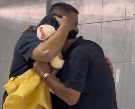 El hombre no puede frenar sus lágrimas y se aferra al peluche, apoyando su cabeza sobre él. Seguidamente, lo abraza uno de sus parientes. Se separan, pero él sigue abrazando el peluche, que luego comparte con una niña, de la cual se desconoce si es su hija, nieta o si tiene algún otro parentesco.