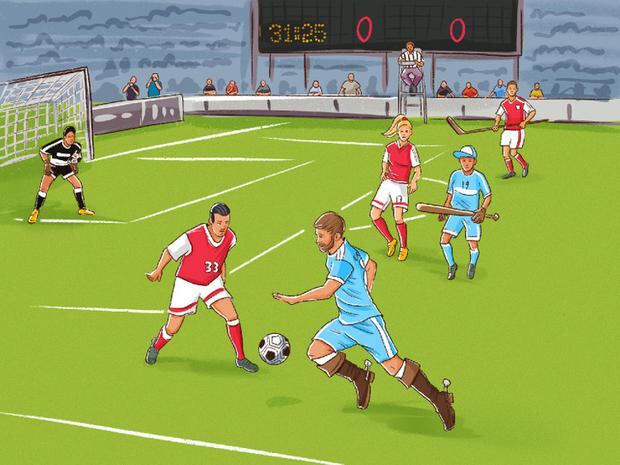Además, hay dos personas con objetos que no son propios del fútbol, ya que un chico sostiene un bate de béisbol, mientras que otro un palo de hockey.