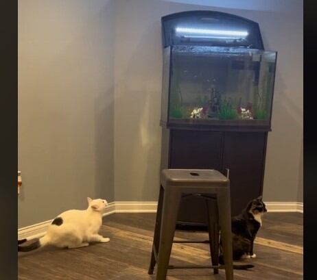 Otro aspecto que llama la atención es el comportamiento de otro gato que lo observaba cuando saltó a la pecera y corrió cuando lo vio caer al agua.
