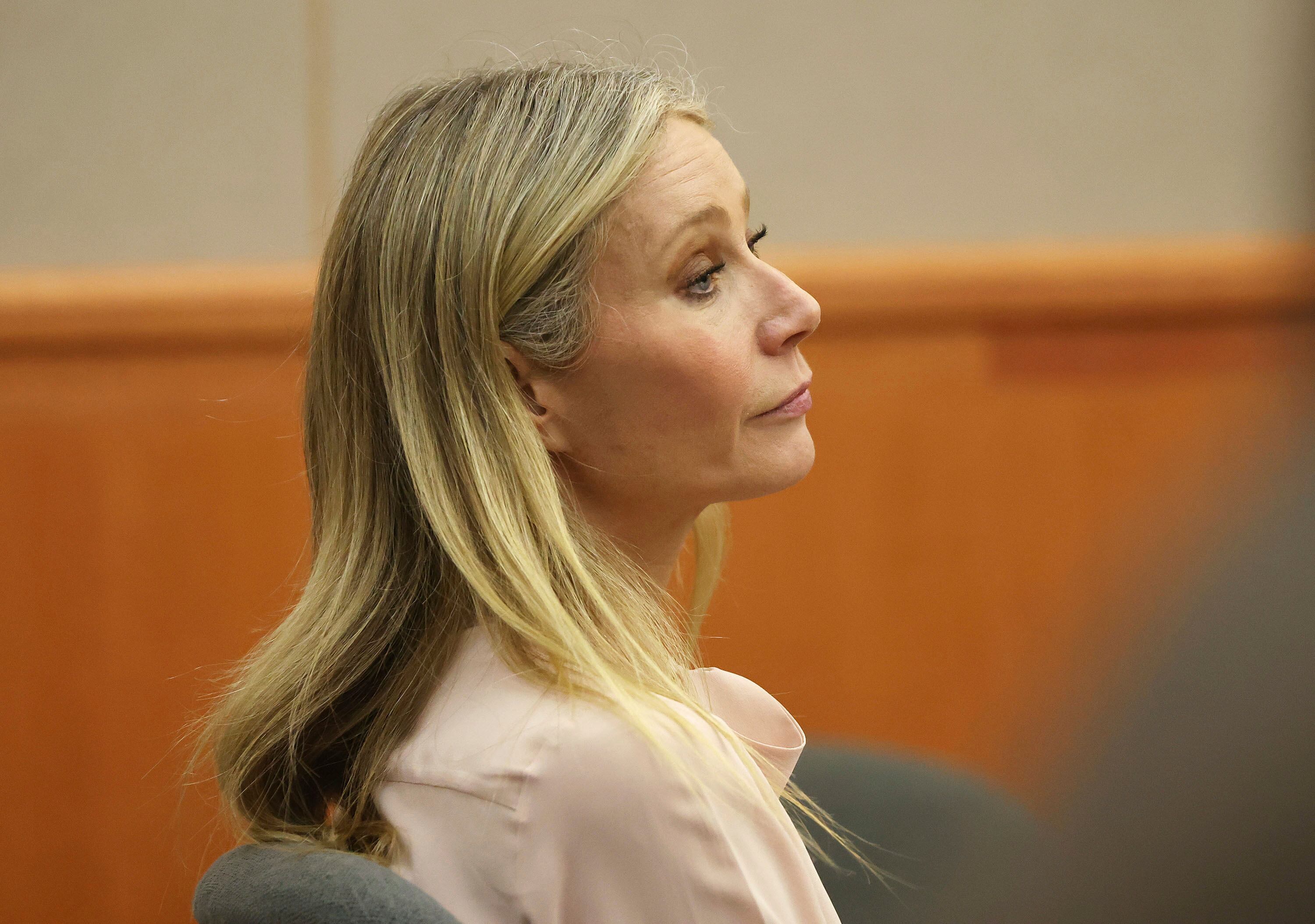 Gwyneth Paltrow escucha en la corte durante su juicio el martes 28 de marzo de 2023 en Park City, Utah. El optometrista retirado Terry Sanderson acusó a Paltrow de esquiar fuera de control, chocar con él y dejarlo con una conmoción cerebral y cuatro co AP (Jeffrey D. Allred/AP)