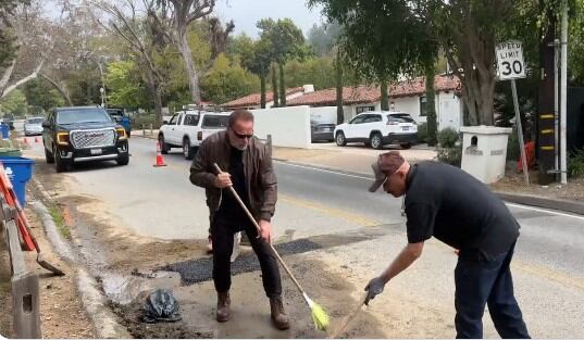 El exgobernador compartió un video en Twitter donde él y otros dos hombres realizaban las labores para reparar la carretera en el área de Brentwood.