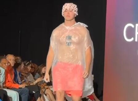 El hombre vestía una bolsa de basura, un gorro de baño rosado, bermudas naranjas y zapatillas blancas. A pesar de que tenía una bolsa de basura, entre el público, nadie se dio cuenta de que no formaba parte del show, ya que en estos desfiles no es de extrañar que los diseñadores presenten atuendos raros, extravagantes o poco convencionales.