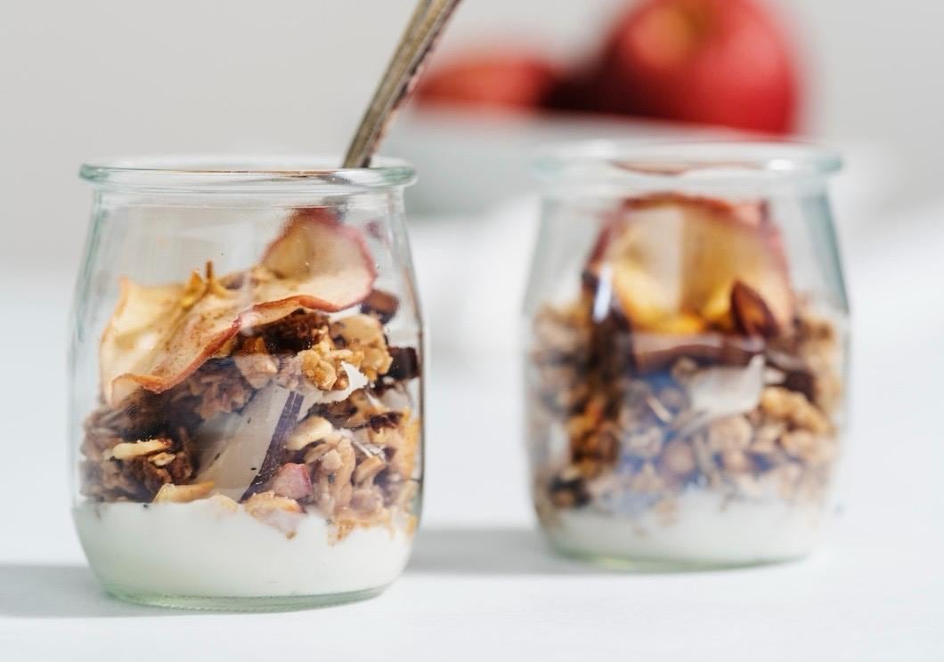 - Parfait crujiente de granola y manzana. En un frasco, arma capas de yogur griego endulzado, ya sea de sabor natural o fresa, granola y manzana con canela. Toma en cuenta que versión endulzada le da un toque extra de sabor sin necesidad de añadir azúcar, por lo que es ideal para un desayuno práctico y delicioso.
