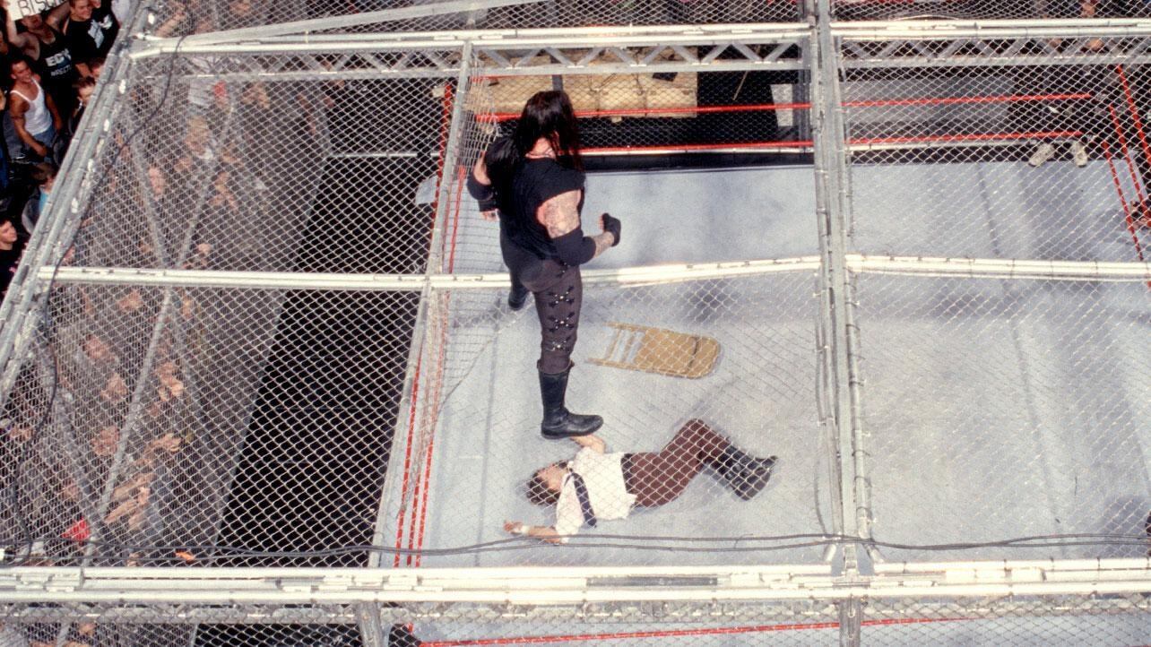 The Undertaker lanzó a Mankind desde lo más alto de la estructura de metal, la imagen fue sorprendente, Mick Foley rompió el techo de la reja y cayó al ring, un golpe seco que dejó paralizados a los aficionados.