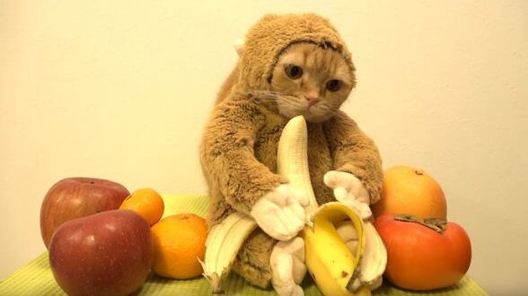 Este tierno gatito disfrazado de mono la rompe en las redes sociales por su ternura y por cómo come una banana igual que los monos.
