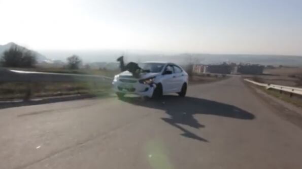 El hecho ocurrió en Rusia cuando un skater que realizaba un descenso por una colina chocó contra un auto. El deportista que estaba siendo grabado por sus amigos tomó una curva sin escatimar en riesgos encontrándose frente a frente con un auto. El choque fue muy fuerte y a alta velocidad, pero el skater se salvó de milagro.