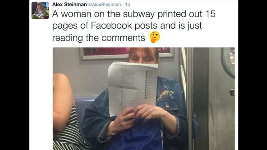 “Una mujer en el Metro imprimió 15 páginas de publicaciones de Facebook y está leyendo los comentarios (emoji)” , fue el tuit que escribió Steinman acompañado de una imagen que muestra a la mujer sosteniendo unas cuantas hojas de papel.