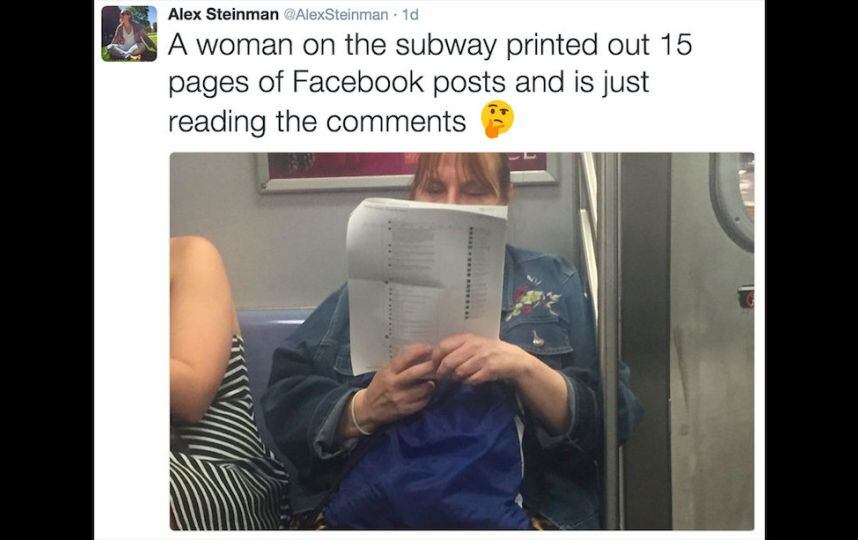 “Una mujer en el Metro imprimió 15 páginas de publicaciones de Facebook y está leyendo los comentarios (emoji)” , fue el tuit que escribió Steinman acompañado de una imagen que muestra a la mujer sosteniendo unas cuantas hojas de papel.