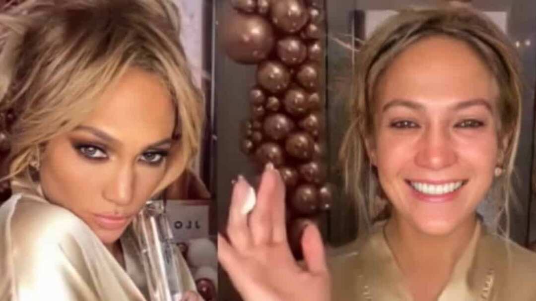 Con una bata dorada JLo inició el vídeo en su lujoso baño decorado con globos. Toda la decoración acorde con la paleta de colores de la marca. Con gran cantidad de maquillaje en el rostro demostró cómo usar la crema limpiadora rosa nacarada que está promocionando; para retirarlo por completo y en pocos segundos solo aplicó agua y un poco de producto.