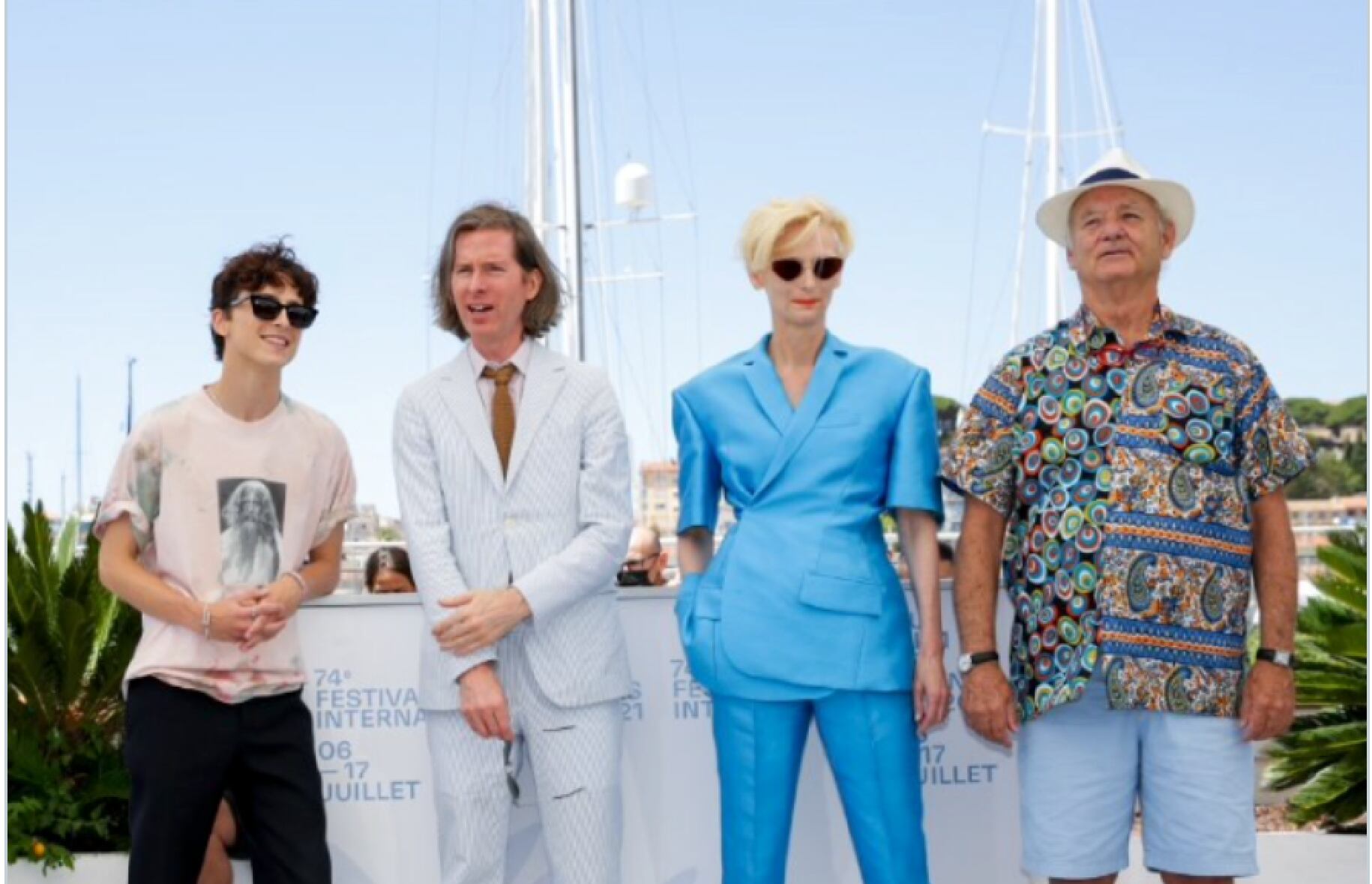Mientras Tilda Swinton deslumbraba con su traje pastel de Haider Ackermann, su diseñador de cabecera; y Timothee Chalamet lo hacía con una camiseta viral, Bill Murray iba muy a lo suyo: con una camiseta hawaiana.