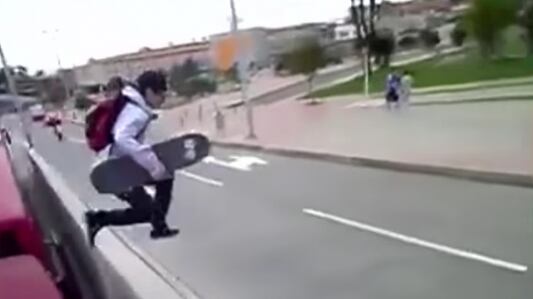 En un video que circula en noticieros y redes sociales se ve a varios menores de edad que hacen maromas sobre los articulados del sistema en el sur de Bogotá. Video: YouTube Red Más Noticias.