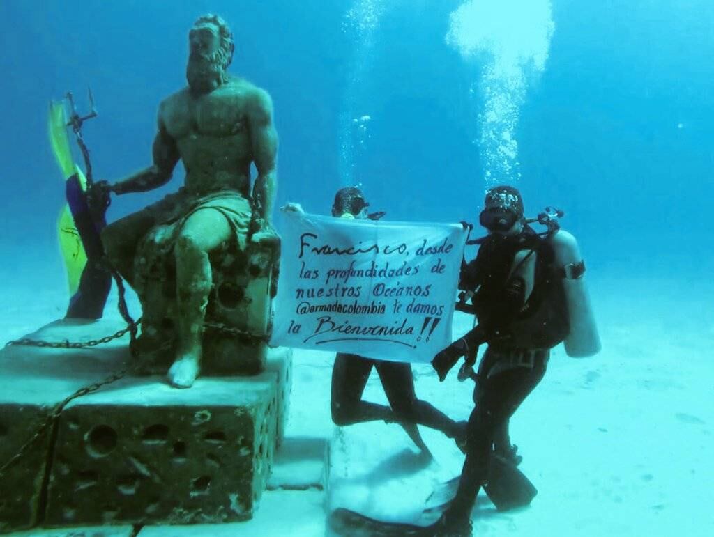 Los expedicionarios bajaron al fondo del mar y se ubicaron en una estatua del Poseidón, dios del mar, con una bandera en la que se leía «Francisco desde las profundidades de nuestros océanos @armadacolombia te damos la bienvenida».