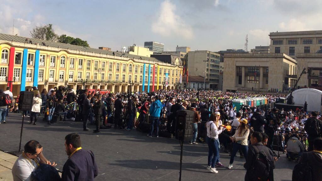 Con un canto que dice: «Esta es la juventud del papa» los jóvenes que se encuentran en la Plaza de Bolívar le dieron la bienvenida a Colombia al papa Francisco.