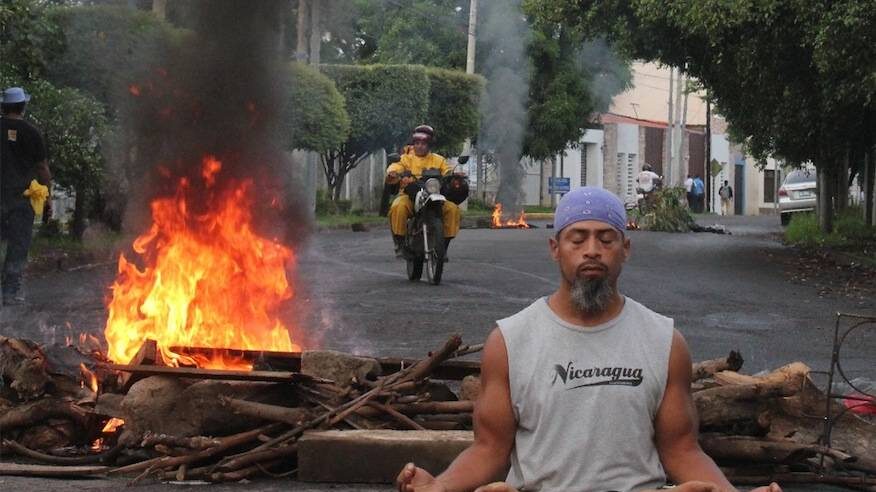 Los manifestantes no se preguntan quién es, pero disfrutan lo que realiza. Anthony junto a un grupo de amigos practican yoga en las protestas nicaragüenses, promoviendo la calma interior, como resistencia al sistema.
