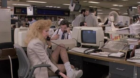 1988: Melanie Griffith encarnaba el prototipo de mujer trabajadora y ejecutiva norteamericana en la película “Working Girl”. Su personaje, Tess McGill, era como las miles de mujeres que en su país iban con zapatillas deportivas al trabajo para cambiarlas por tacones en la oficina. En la era de los trajes para trabajar, encarnada por Donna Karan, Armani, Thierry Mugler, los tacones eran considerados símbolo de poder, como desde hace siglos en la parte masculina. Tanto se popularizó, que llegó a ser imperativo en el dress code corporativo.