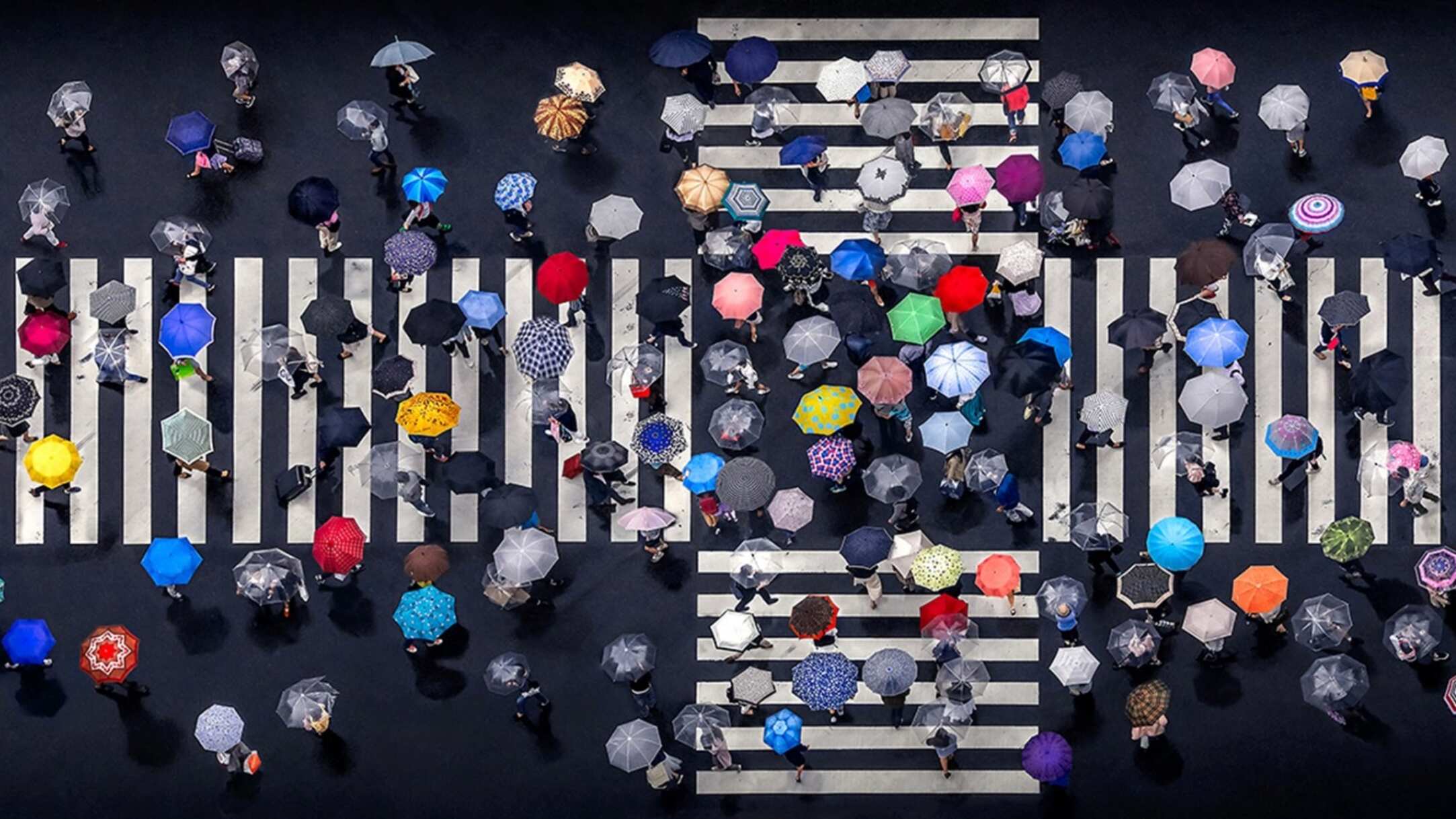 El cruce lleno de paraguas trae colores en un lienzo gris de lluvia en una calle de Japón. Daniel Bonte