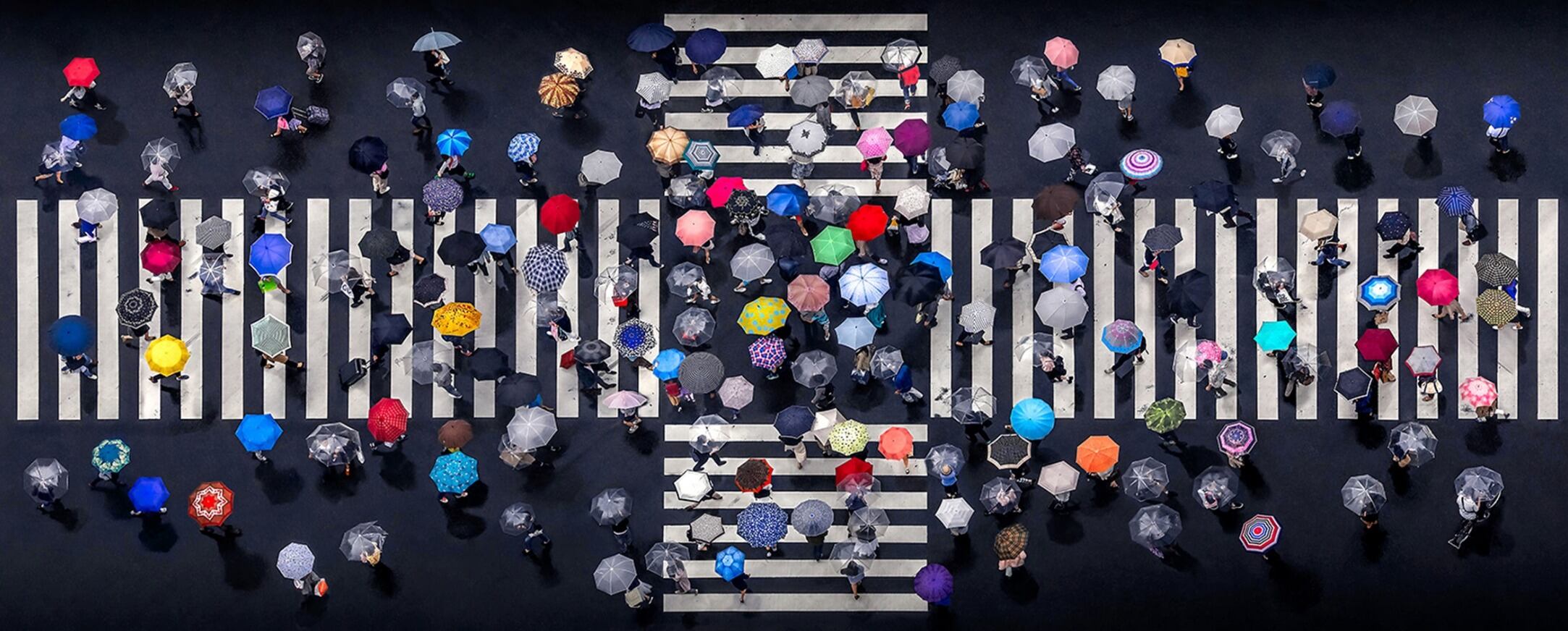 El cruce lleno de paraguas trae colores en un lienzo gris de lluvia en una calle de Japón. Daniel Bonte